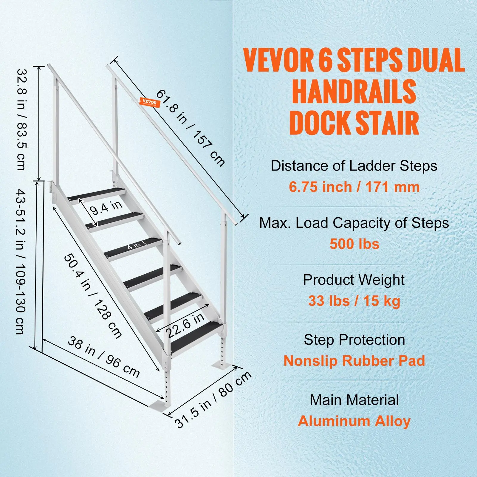 • Dual Handrails Design: Our dock ladder is equipped with reinforced dual handrails for comfortable holding. The elderly and children are more reassured when getting in and out of the water.