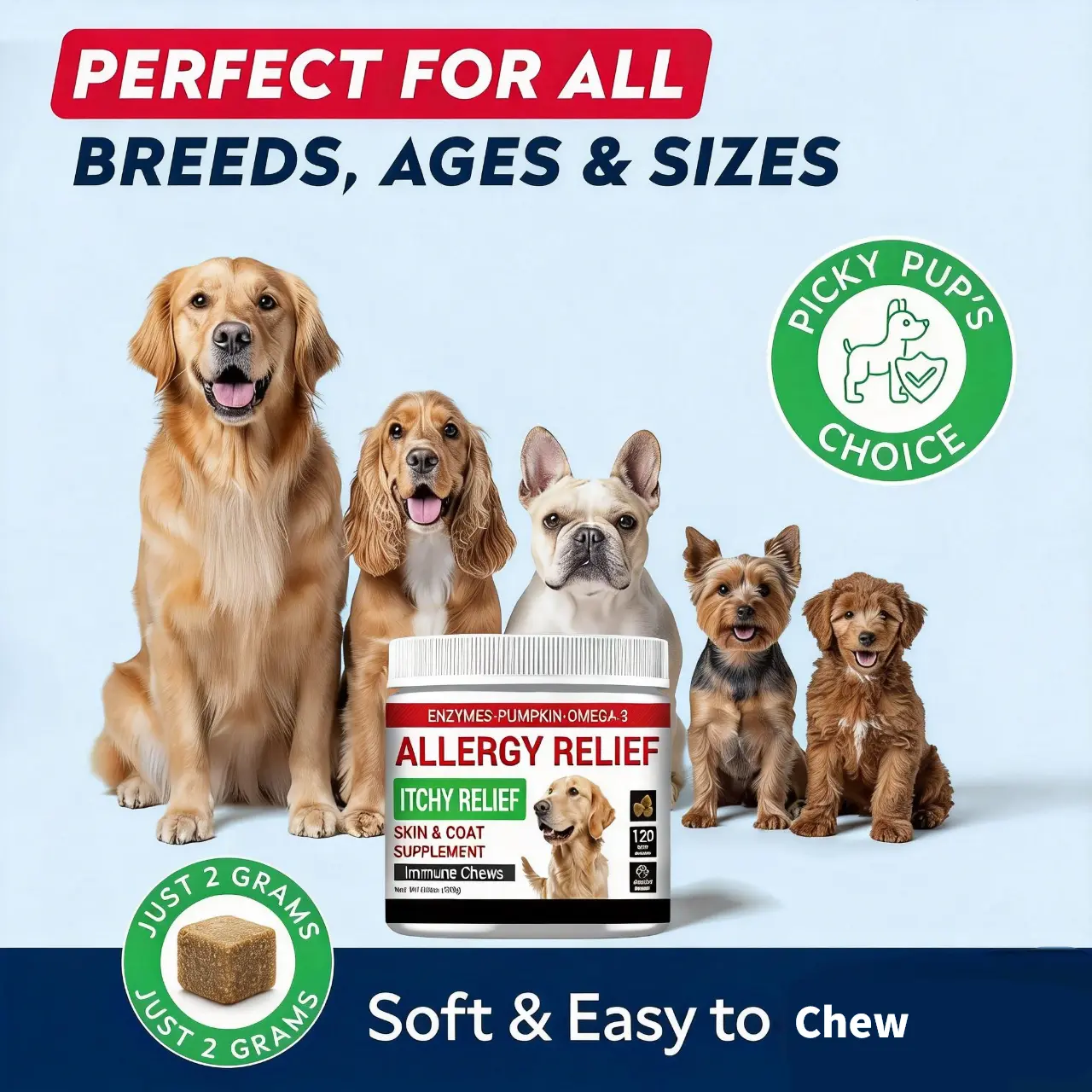 DELICIOUS & EFFECTIVE – Our dog skin allergies treatment is a blend of efficacy and taste, helping control seasonal allergies. Your dog will love the smell and flavor of these mouthwatering bites.