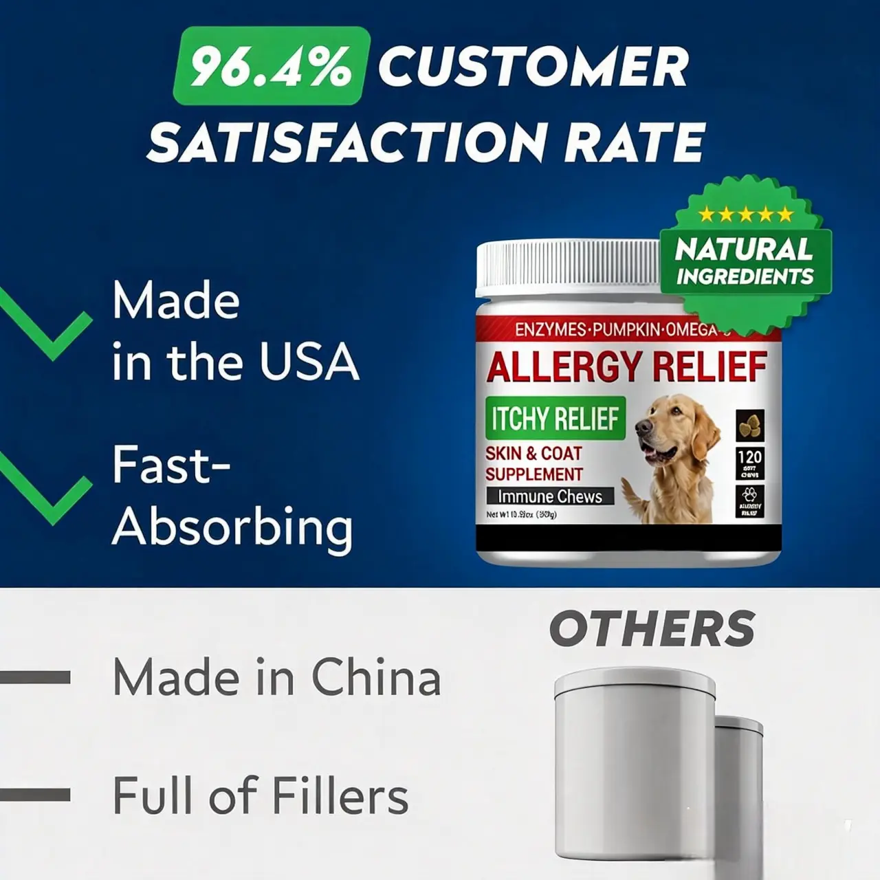 TOP-NOTCH CARE FOR YOUR CANINE – Only the finest, all-natural ingredients including Omega-3 fatty acid make up our dog allergy relief chews. Check out these remedies for your dog's sensitive skin in the ingredients section listed above.