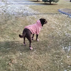 These boots will be great for winter and rainy days! There is a good grip on the bottom of the boots and may also be good for hiking. These fit right over Thanos’s dew claws. There are adjustable straps and also a pull string to adjust around the legs.