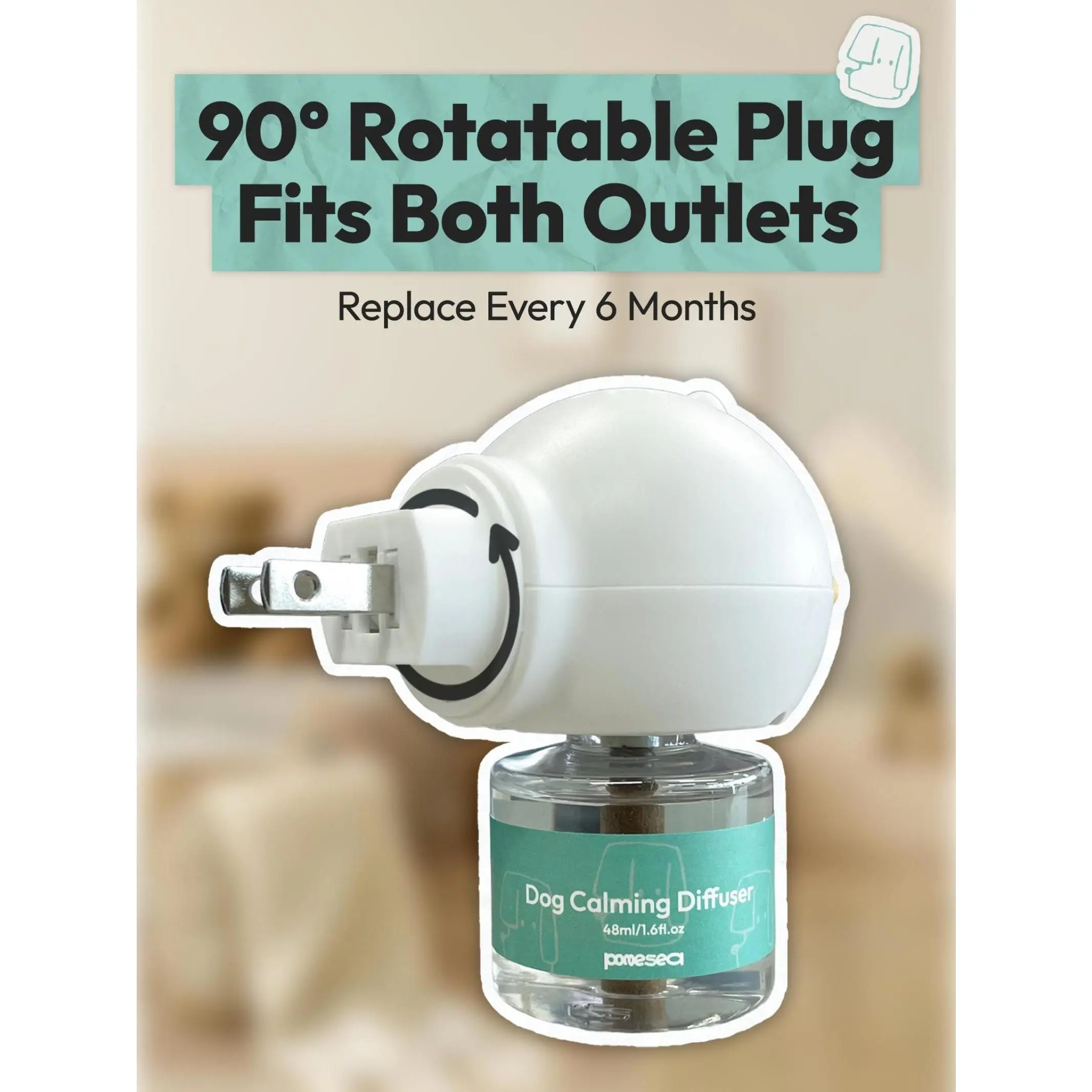 I’ve had the diffuser plugged in for a week now and there has been no accidents in my house by my dog and she seems to be more calm, which is wonderful In The picture you can see my dog, relaxing on the couch and over to the right on the shelves you can see the diffuser plugged in