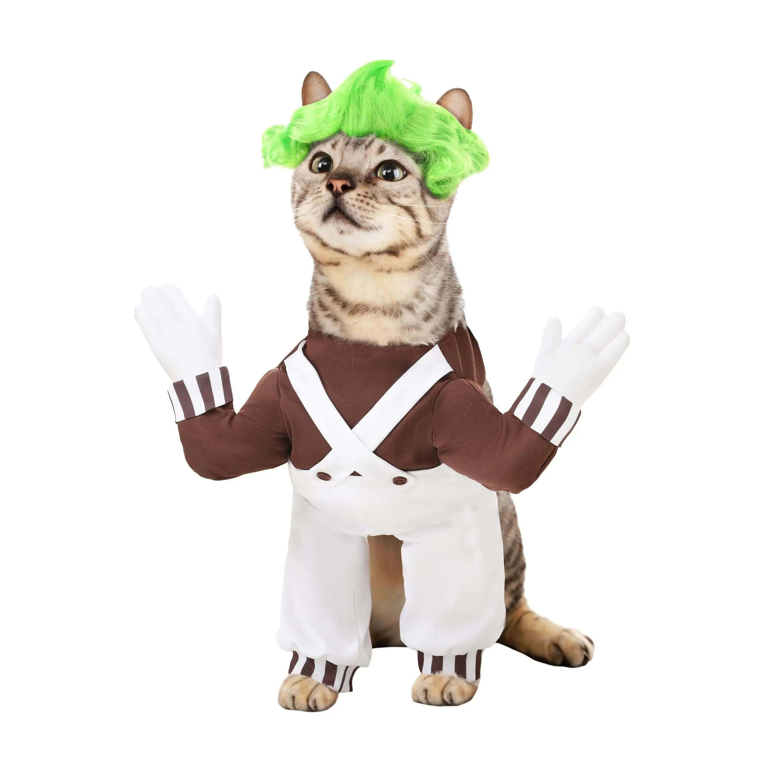 Bring home a sweet treat when you buy this exclusive Dog Oompa Loompa costume. This Made By Us pet costume is a front coat detailed to look like the Chocolate Factory workers from the classic tale. Your animal's front feet step into the legs of the 'Loompa and a hook and loop strip holds the look in place down their back. A bright green headpiece fits with an adjustable strap to give them the iconic neon hairdo and your doggo is ready to work!