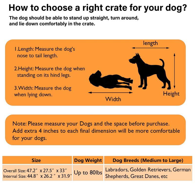 【Spacious Interior】 Overall dimensions is 47.2"W x 27.5"D x 33"H. This large dog crate offers ample room for large breeds to stand, turn around, and lie down comfortably.