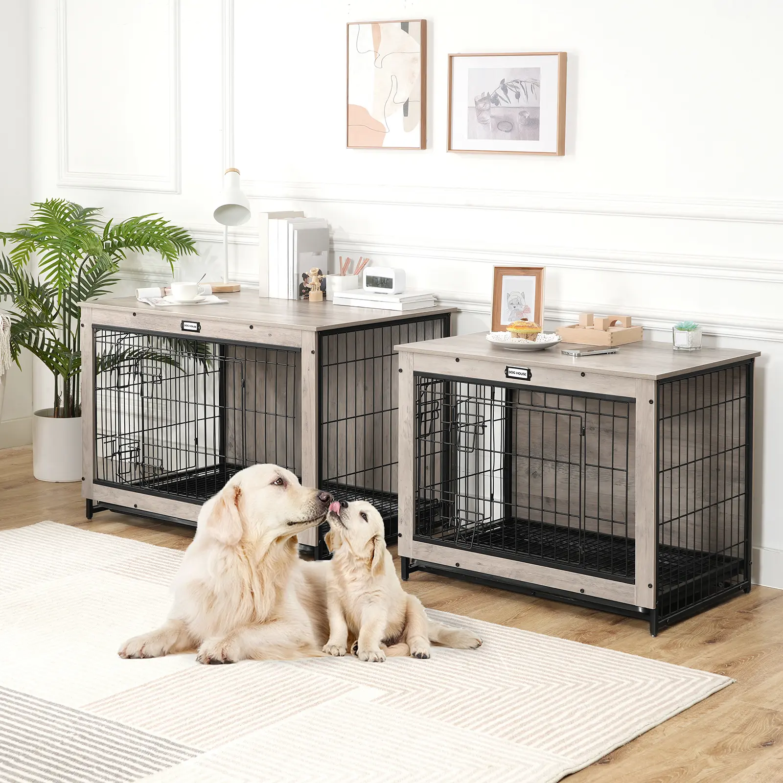 This furniture-style dog cage has front and side openings for access.