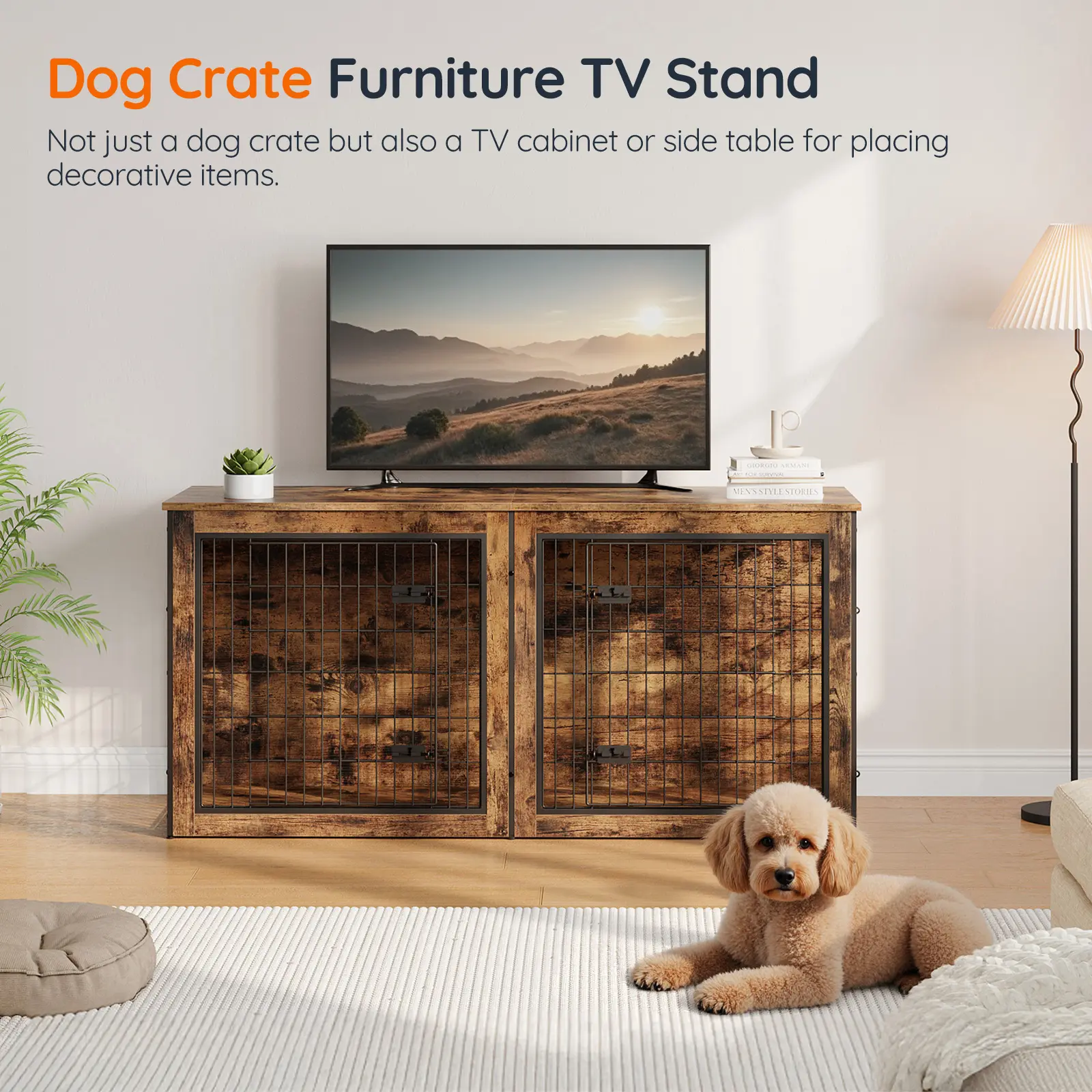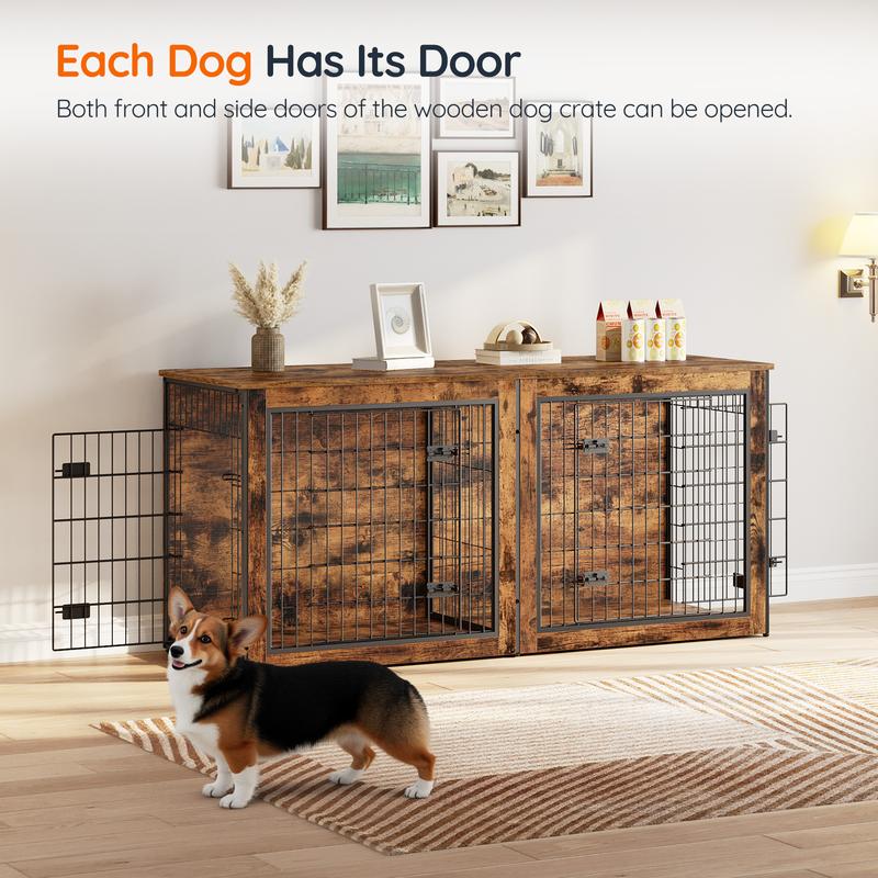 Measuring 63"L x 21.7 "W x 29.5"H, this dog crate furniture offers a cozy home for pets and doubles as a side table or TV stand.