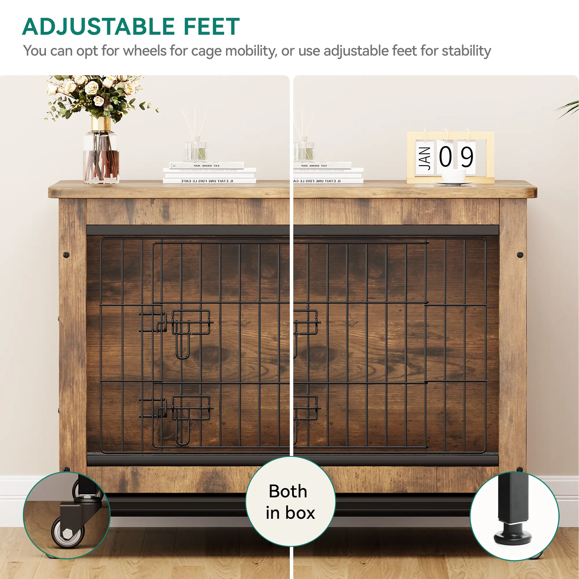 Mobile and Stable: The dog cage sits on 4 wheels (2 with brakes) so it can be easily moved and securely positioned anywhere in your home; The adjustable feet ensure stability on uneven floors, providing your pet with a steady and safe environment