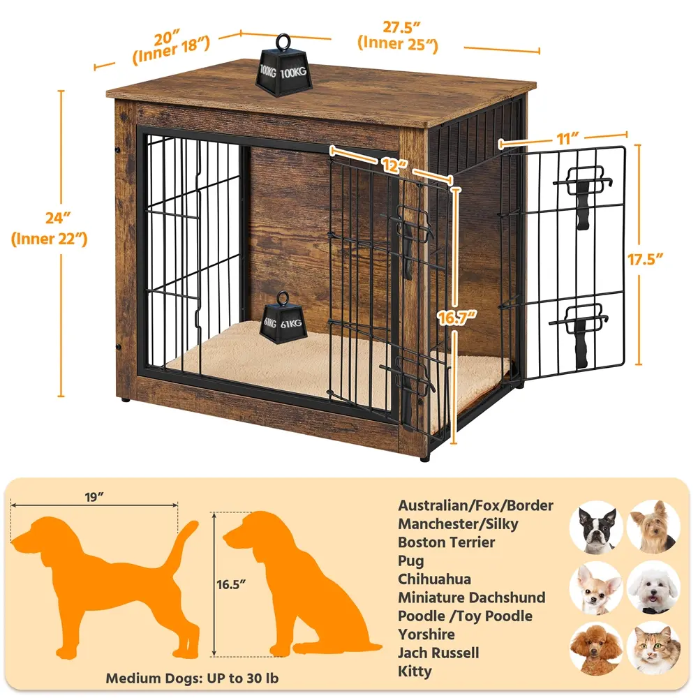 An ideal blend of pet furniture and human needs! This multi-functional dog crate furniture aims to create a cozy shared living space for both dogs and their loving owners. Crafted with substantial materials such as powder-coated metal wires and CARB P2-compliant MDF with scratch-resistant lamination, this dog crate furniture boasts durability and exceptional strength, serving as a reliable kennel and a stylish side table all in one. With an interior space measuring 25″ W, 17.7″ D, and 26.7″ H, and a bar spacing of 1 3/8-1 1/2″, this dog kennel furniture is ideal for puppies and small-sized dogs like chihuahuas, Yorkshires, Pomeranians, and mini schnauzers. Better still, we've gone the extra mile to ensure convenience and comfort with thoughtful features such as double doors, rounded corners, a plush foam-padded mat with a removable cover, and an easy-to-clean waterproof surface. Just say goodbye to clutter and hello to a harmonious living space for you and your furry friend!