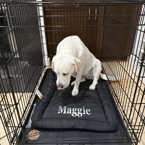 This was a gift for a boyfriend's dog as the pad she had was smaller and moved around a lot. She is a beautiful large lab. Not much of a chewer, but does like to dig or nest. She is still a puppy. This stays put in both her metal and plastic crates. She has room to move around, which she does, and the pad stays put. I had it personalized and it looks great. Black with silver letters.