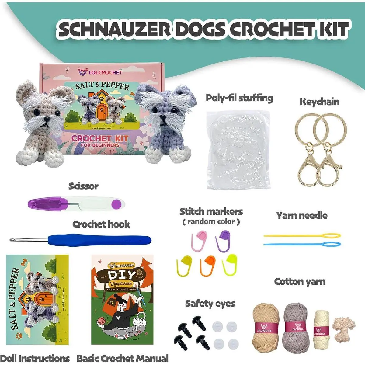 ALL-IN-ONE STARTER KIT - Our beginners crochet kit comes with everything you need to complete your fluffy Schnauzer dog plush: easy peasy yarn, ergonomic beginner crochet hook(4mm), step-by-step video tutorial, printed instructions booklet, plenty of stuffing, keychain, a needle, a scissor, safety eyes and marker clasps.