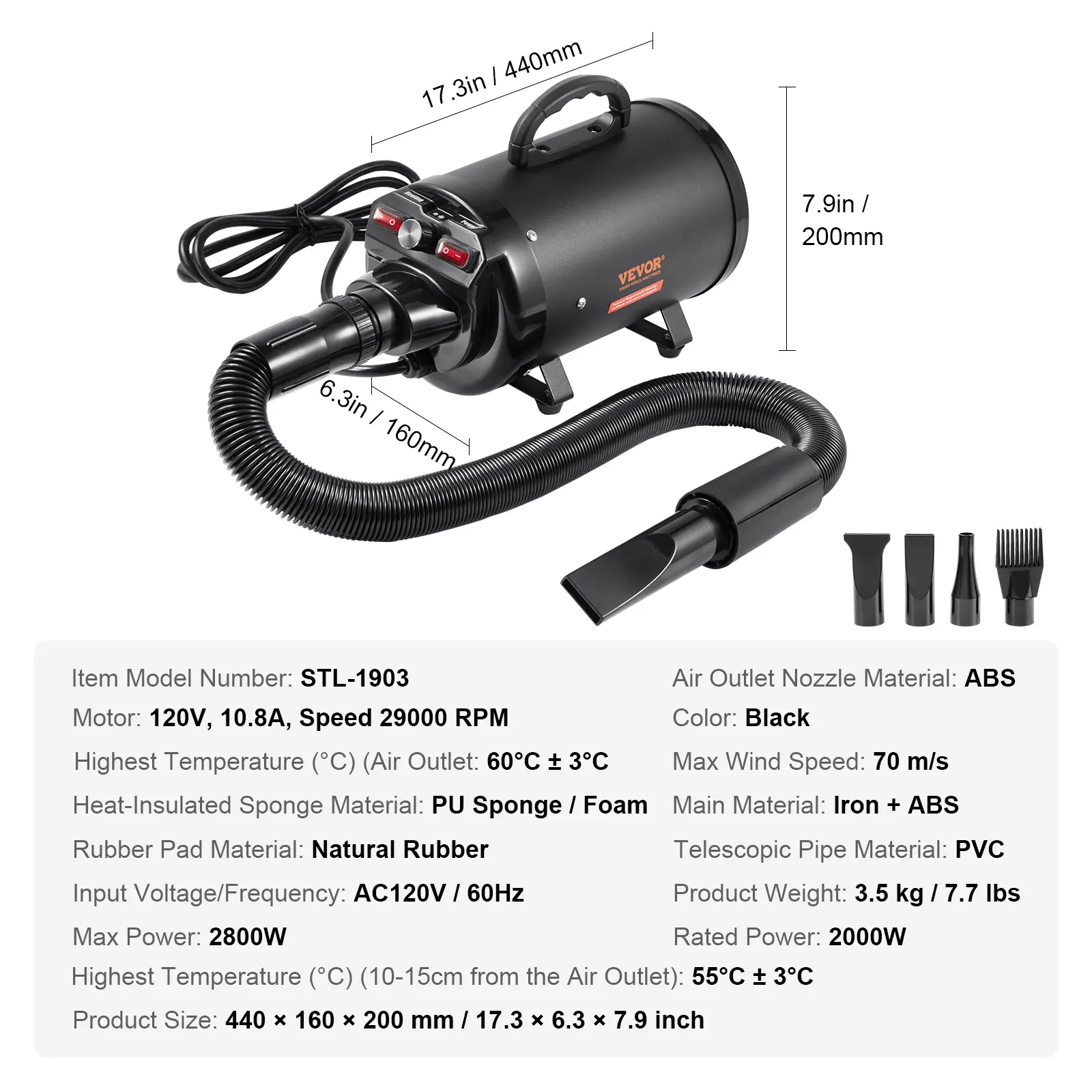 • Powerful Performance: Boasting a 2800W/4.3 HP motor and a temperature range of 85°F to 135°F, this dog dryer significantly speeds up dog's drying process. The dual-temperature control settings facilitate deep drying of your pet's fur, preventing skin issues caused by dampness.