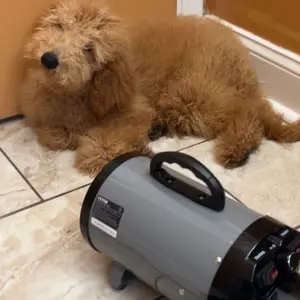 Our dog dryer with a powerful 2000W/2.7HP motor reaches a max wind speed of 70m/s and offers temperature control ranging from 85°F to 130°F. It's suitable for various types of pets, ensuring quick drying of their fur.