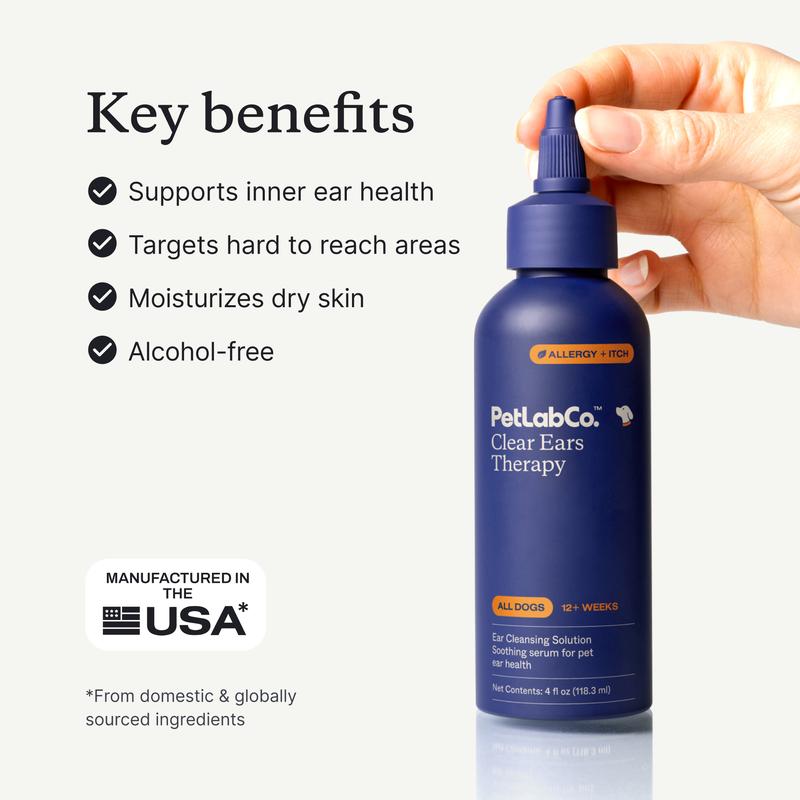 Our Clear Ears Therapy dog ear wash contains salicylic acid and ketoconazole — two dynamic ear cleaning ingredients. Ketoconazole can support and cleanse sensitive skin in the ears. Salicylic acid helps support occasional irritation and promotes normal moisture retention within the ear canal.