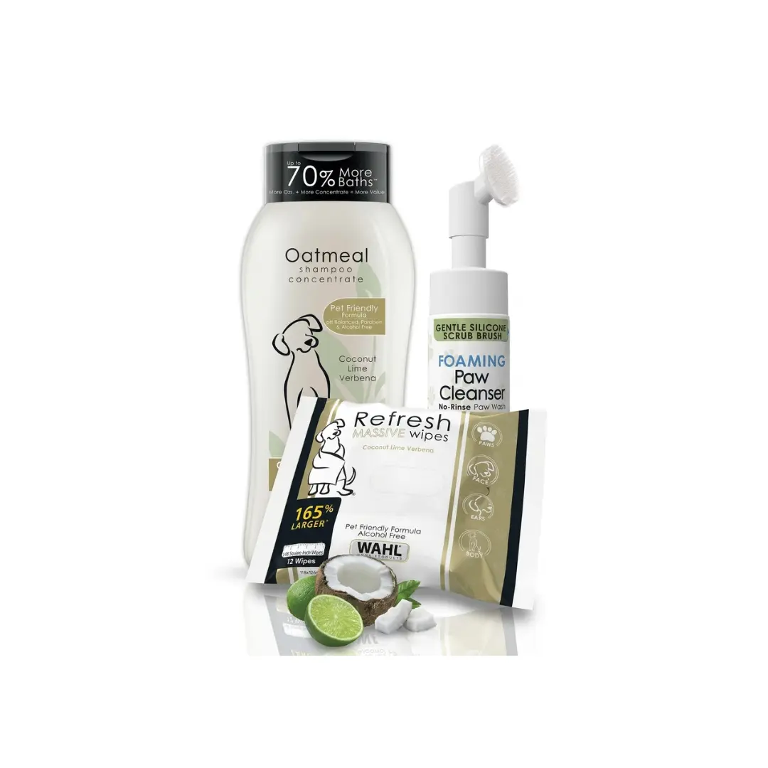 Keep your pup clean, fresh, and odor-free from head to paw with this limited-time Wahl grooming bundle. Designed for quick cleanups and full bath days, this set includes extra-large dog wipes, soothing oatmeal shampoo, and a no-rinse foaming paw cleaner—everything you need to handle muddy paws, dirty coats, and everyday messes.