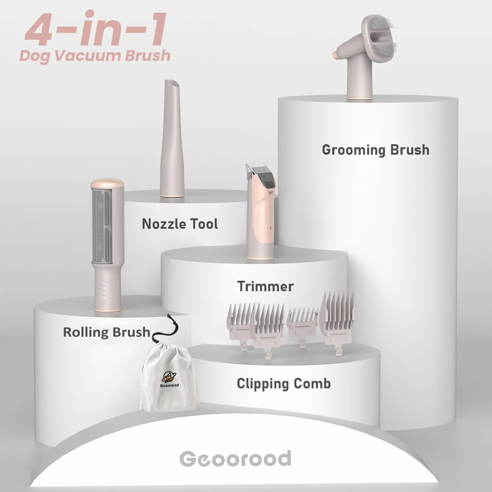 ·Dusty Pink (4-in-1) - With Storage Bag Basic Set Includes: Main unit, hose, nozzle tool, grooming brush, rolling brush, trimmer, 4 guide combs (3/6/9/12mm), storage bag. Selling Point: Meets basic grooming and vacuuming needs. Simple, practical, and easy to store.