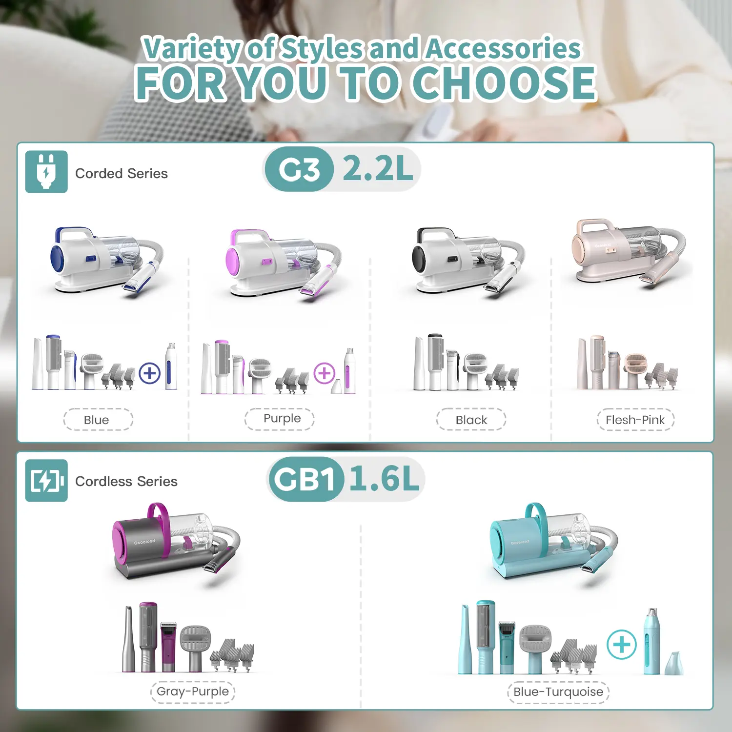 ·Turquoise (6-in-1) - Cordless with Nail Grinder & Paw Trimmer Full Set Includes: Cordless main unit, hose, nozzle tool, grooming brush, rolling brush, trimmer, 4 guide combs (3/6/9/12mm), nail grinder, paw trimmer, storage bag. Selling Point: Offers complete functionality with the freedom of cordless operation and a library-quiet experience, perfect for nervous pets .