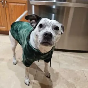 First clothes that fit my little pitty without straggling her armpits or throat. Great quality, super soft, super warm. I will definitely buy more. Without the hood 😂 she's not a fan of the hood, but it makes me laugh. I just pinned it back so it stops falling in her face.