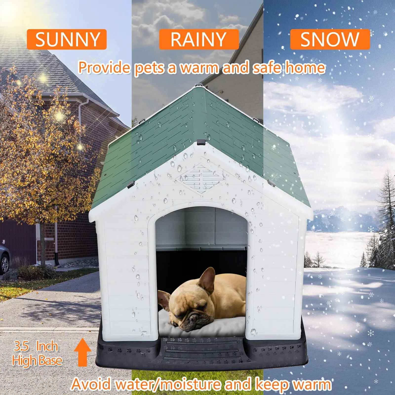 The higher floor design effectively prevents rainwater from entering the house, providing a dry and comfortable space for your dog.