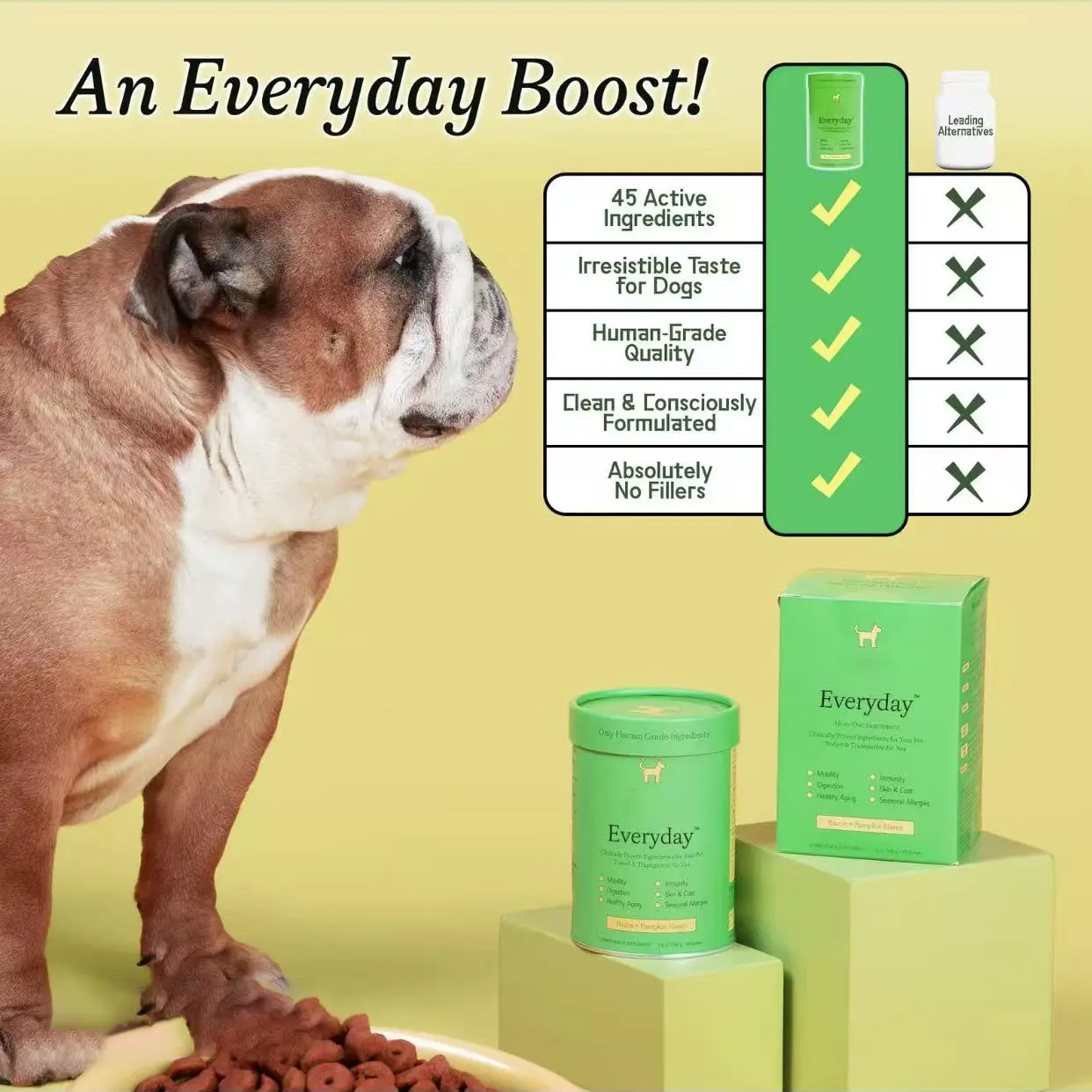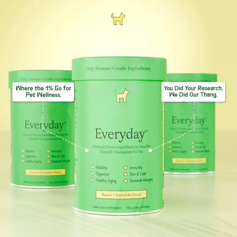 Everyday - Clean Dog Multivitamin Supplement is a comprehensive health booster for your dog, supporting mobility, gut & immune health, healthy aging, and skin & coat health. It is clinically tested, veterinarian-recommended, and easy to serve. Enjoy maximum health benefits in every scoop!