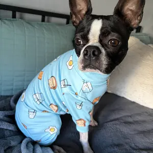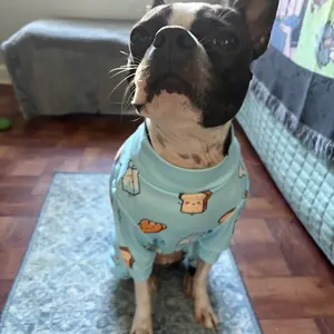 Lexi’s new Spark Paws PJs are adorable! 💙 Light blue with eggs, toast & milk — perfect fit in size Large (she’s a 20lb Boston Terrier). Super soft, amazing quality. I might need every pattern! 😍🐾 #SparkPaws #TheBougieBT