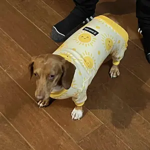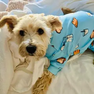 Jax loved his new pajamas and would’ve kept them on all day if it weren’t still 80 degrees outside. The material is so soft and it calmed his anxiety, definitely will be buying some more especially for Christmas! Thank you. For size reference he’s about 22lbs, mini schnauzer chipoo and the L fit perfectly!