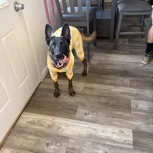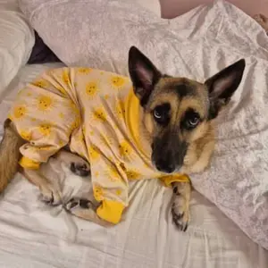 Looks really cute on my GSD mix girl!! She was kind of between the sizes, we went with the bigger 3XL and overall a good fit, just a little loose and slides down to her tail base a bit. We used this after she had surgery so she couldn't reach the stitches on leg - definitely lot more comfortable than having to wear a cone! And she appears calmer overall when she is wearing the pajamas.