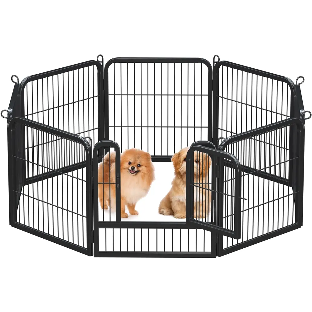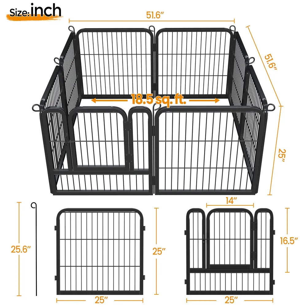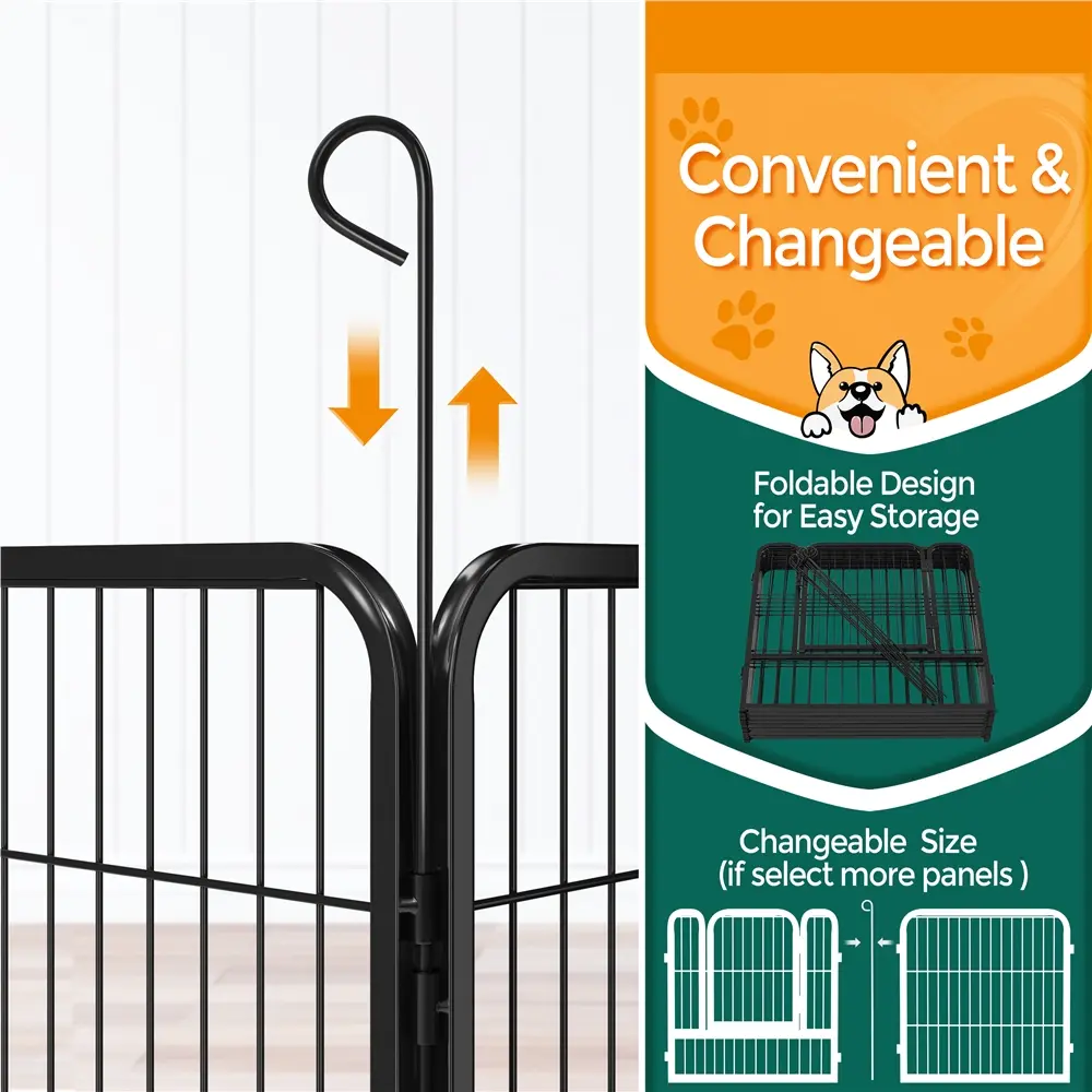 4.【Safety & Security】We prioritize the safety and well-being of your furry companions above all else. To ensure their security, our exercise pen has been designed with features such as appropriate bar spacing, a automatic locking latch on the door, and rounded edges to prevent any potential injuries, while also preventing damage to wood or PVC flooring.