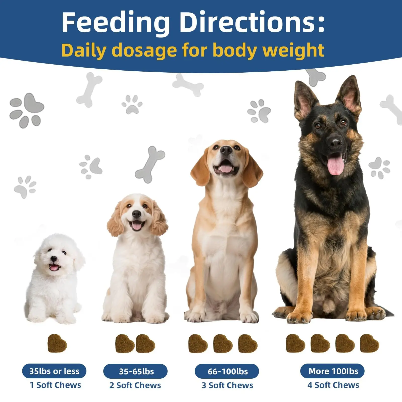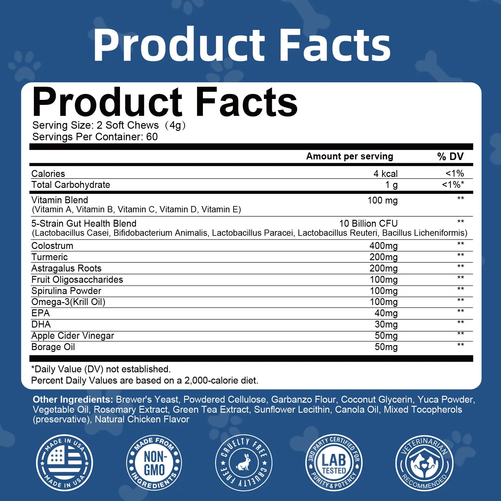 Each serving of our dog probiotic chews delivers 10 billion CFUs and a multi-strain probiotic formula—specifically containing Bacillus subtilis, Lactobacillus acidophilus, Lactobacillus plantarum, and Bifidobacterium animalis. This carefully selected strain mix helps restore balanced gut flora, relieve constipation, improve digestive tract function, and enhance stool quality. It is also a budget-friendly option for your puppy, offering better efficacy and a longer supply duration.