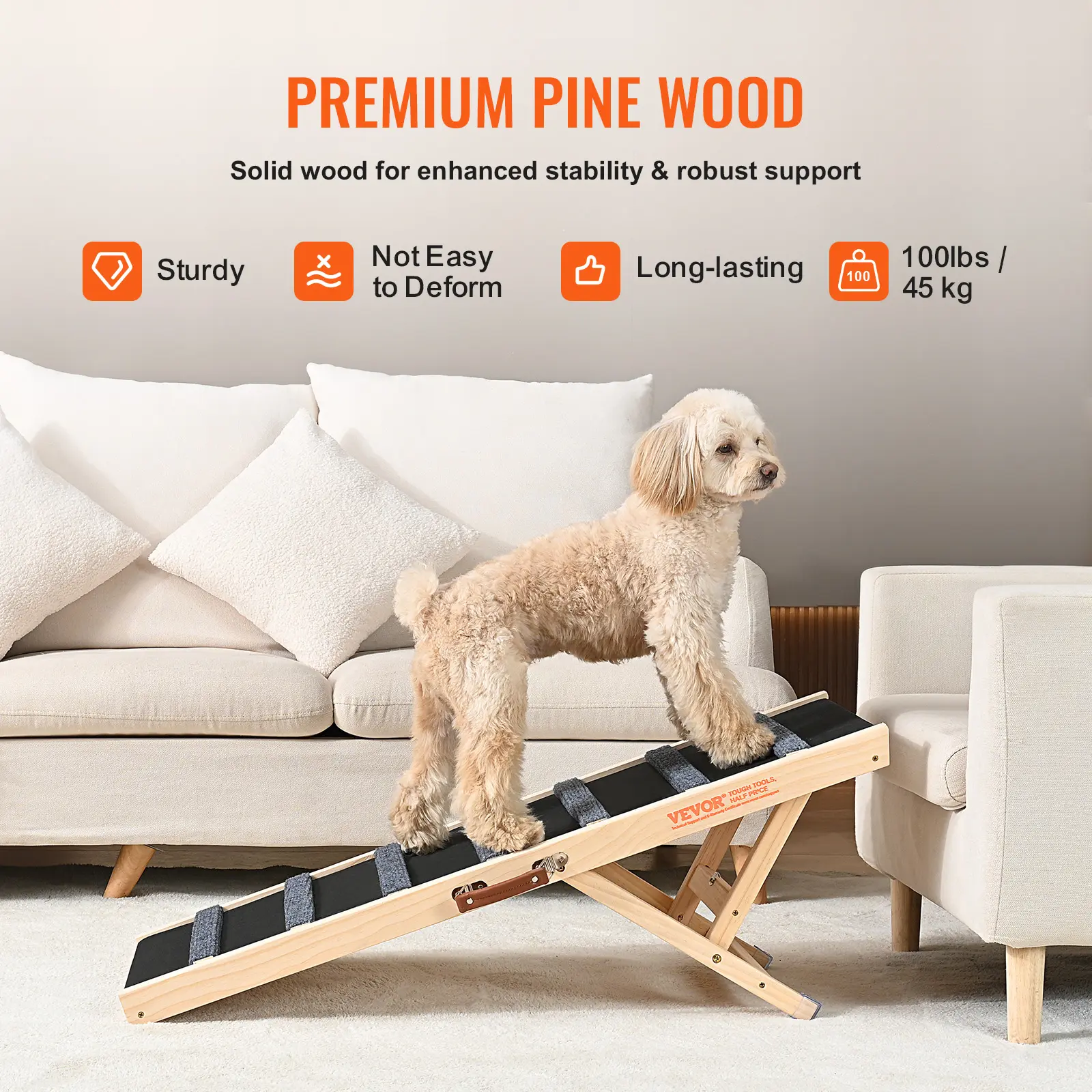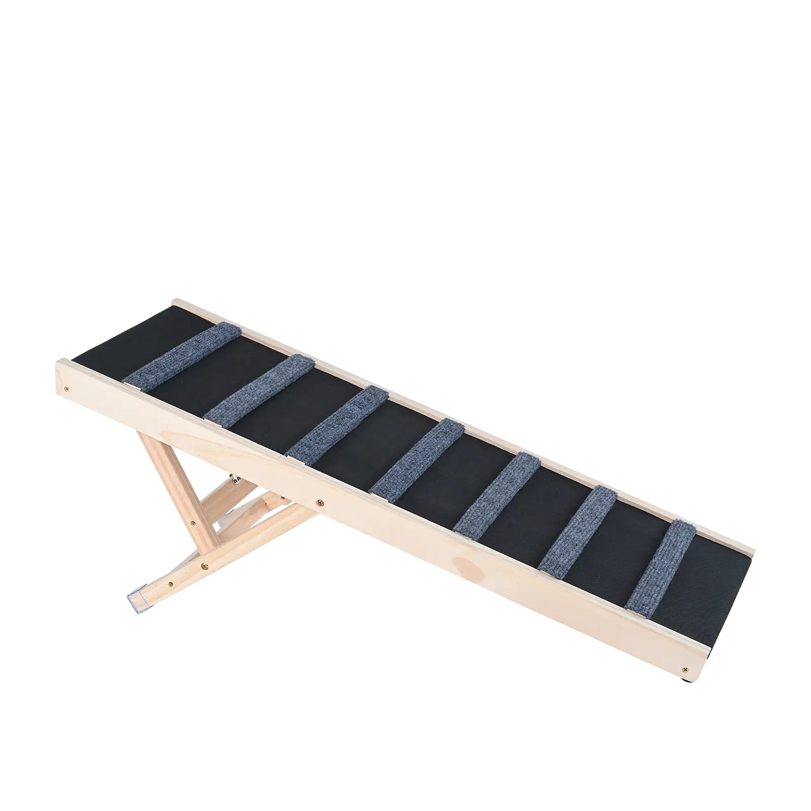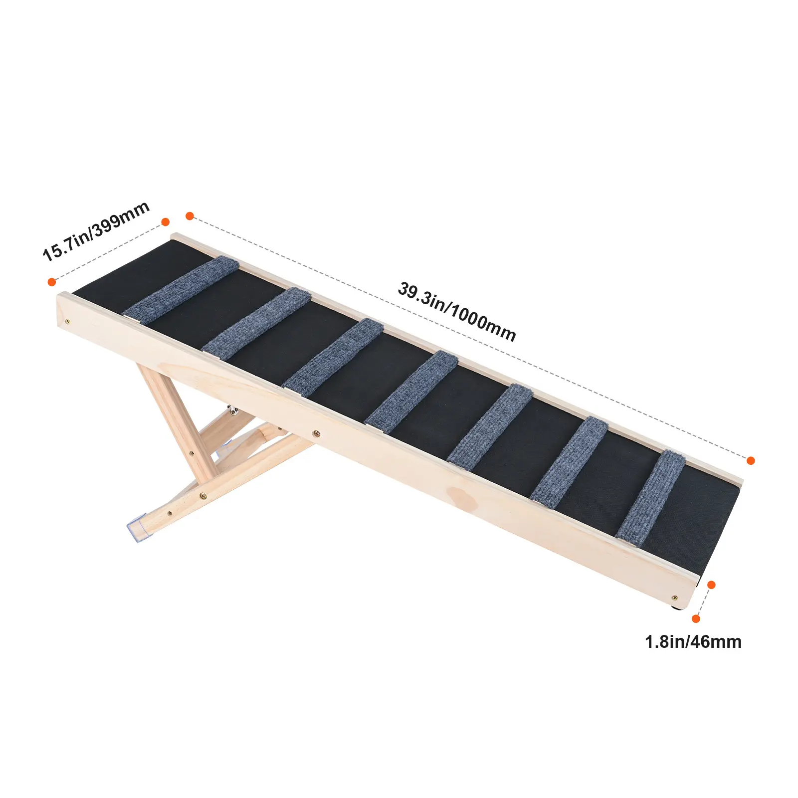 • Sturdy and Durable: Crafted from premium pine wood, this solid wood adjustable dog ramp is exceptionally stable and can support pets weighing up to 100 lbs. The addition of soft rubber footpads at the bottom ensures stability during your pet's ascent.