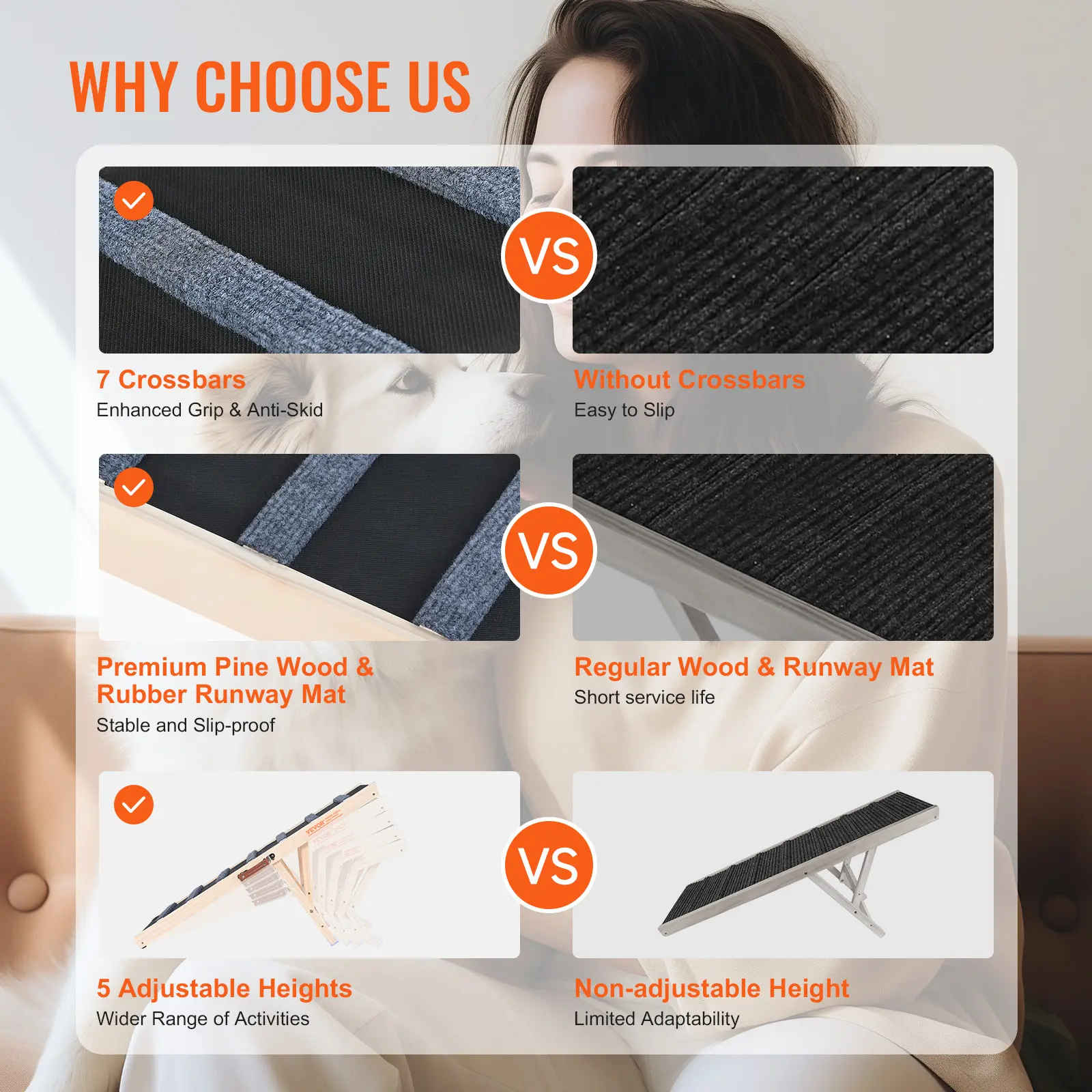 • High Traction & Non-Slip Surface: The dog ramp features a high-traction rubber carpet with grooves, providing your pet with a secure and non-slip surface. The ramp's design includes 7 crossbars that offer added grip to prevent slipping and falling during climbs.