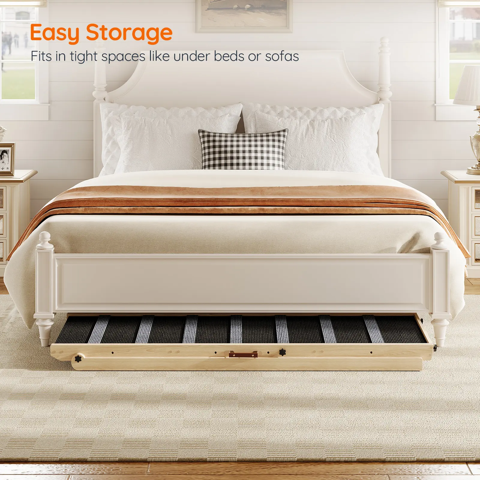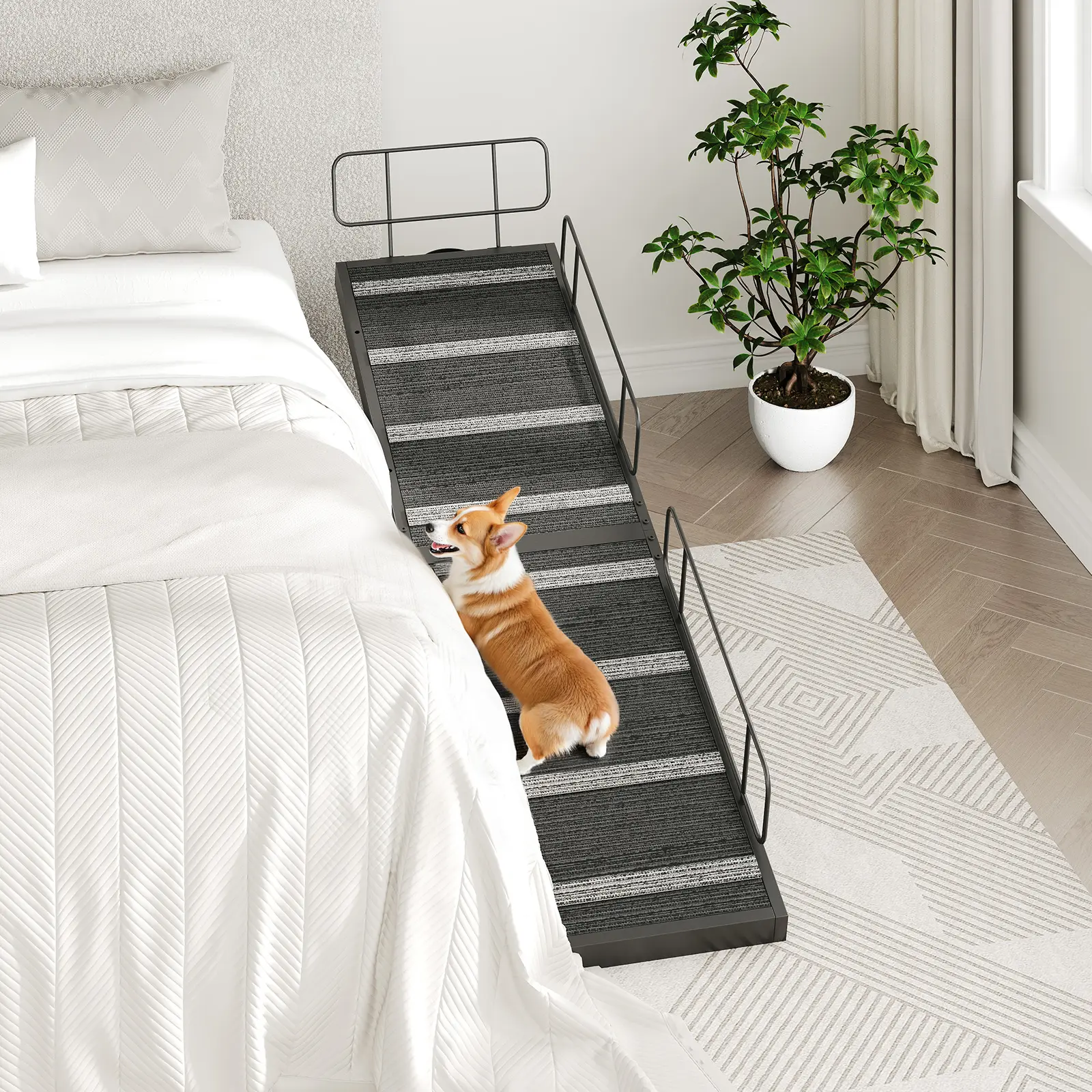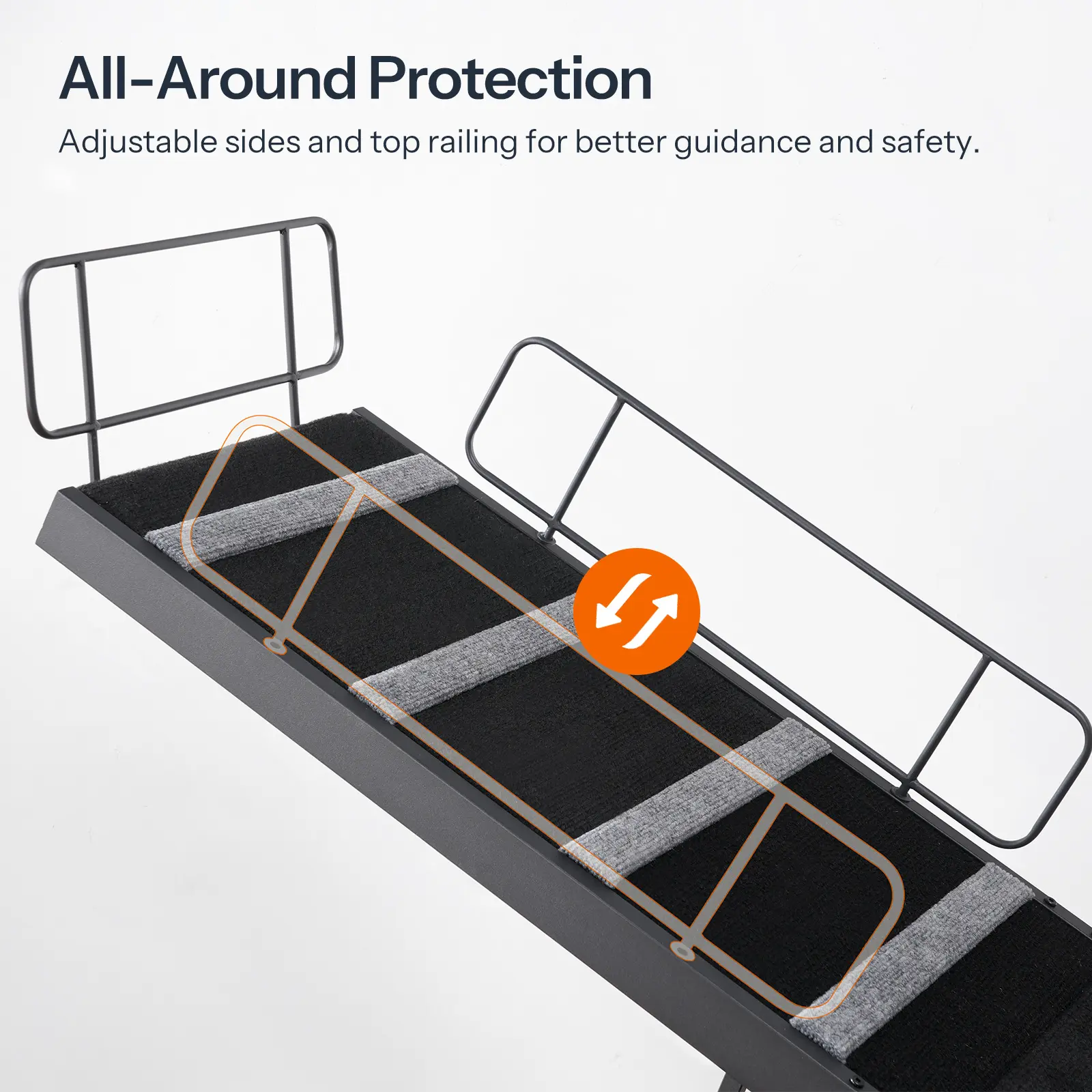 Safety Design: The pet ramp features reversible safety rails and a top barrier, effectively guiding your dog to their destination while preventing accidental falls.