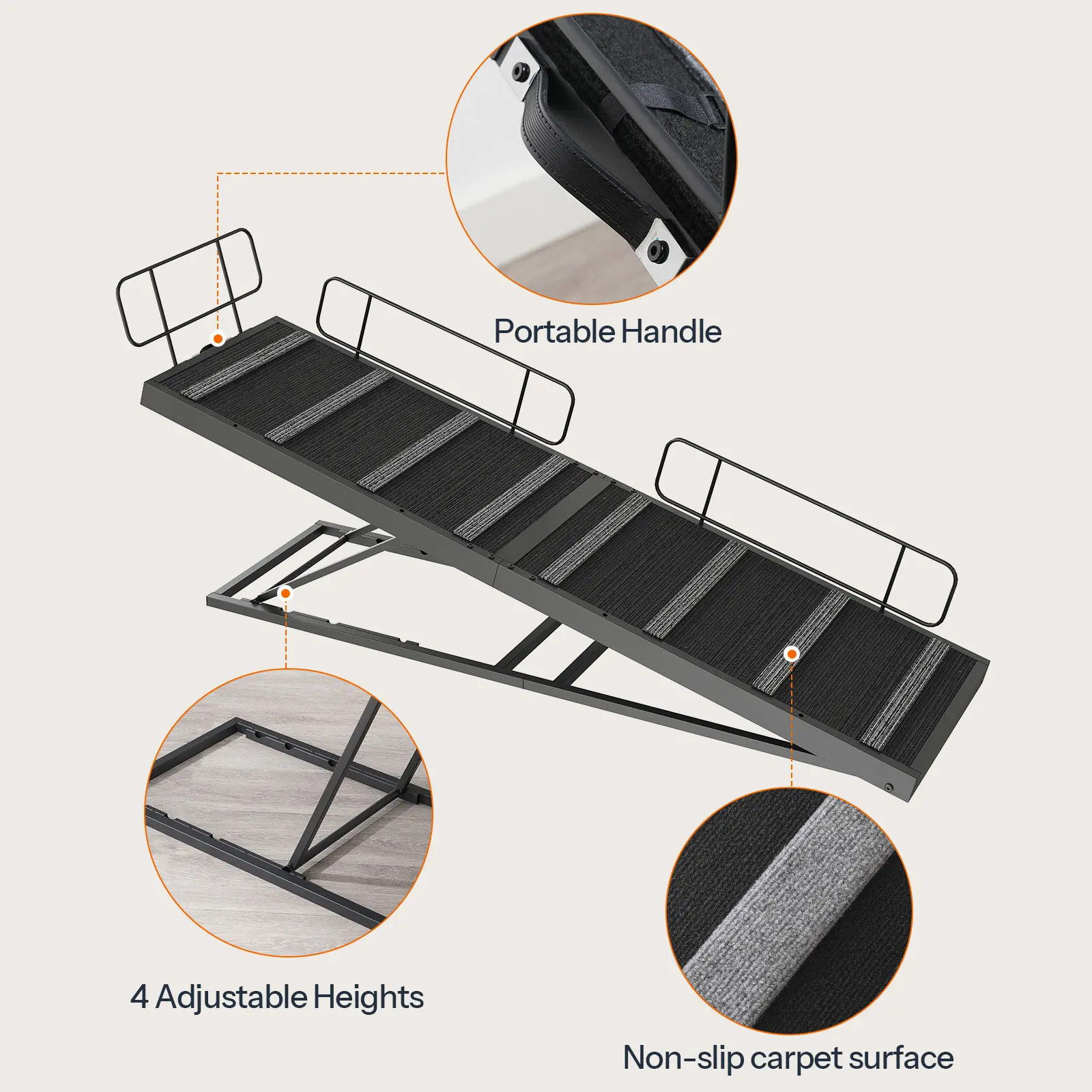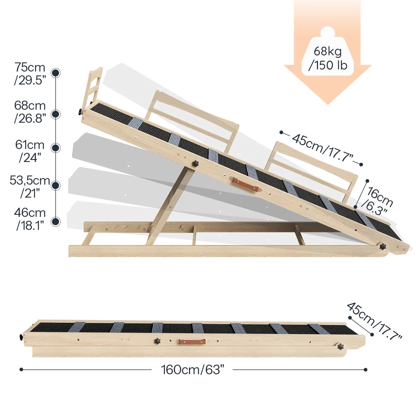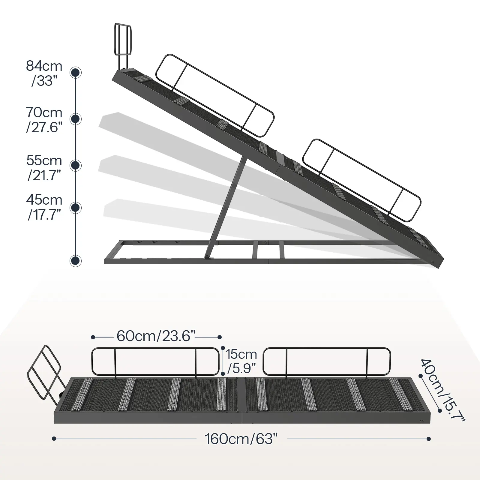 The 63" long dog ramp offers 4 adjustable heights of 17.7", 21.7", 27.6", and 33", fitting the height of beds or sofas.