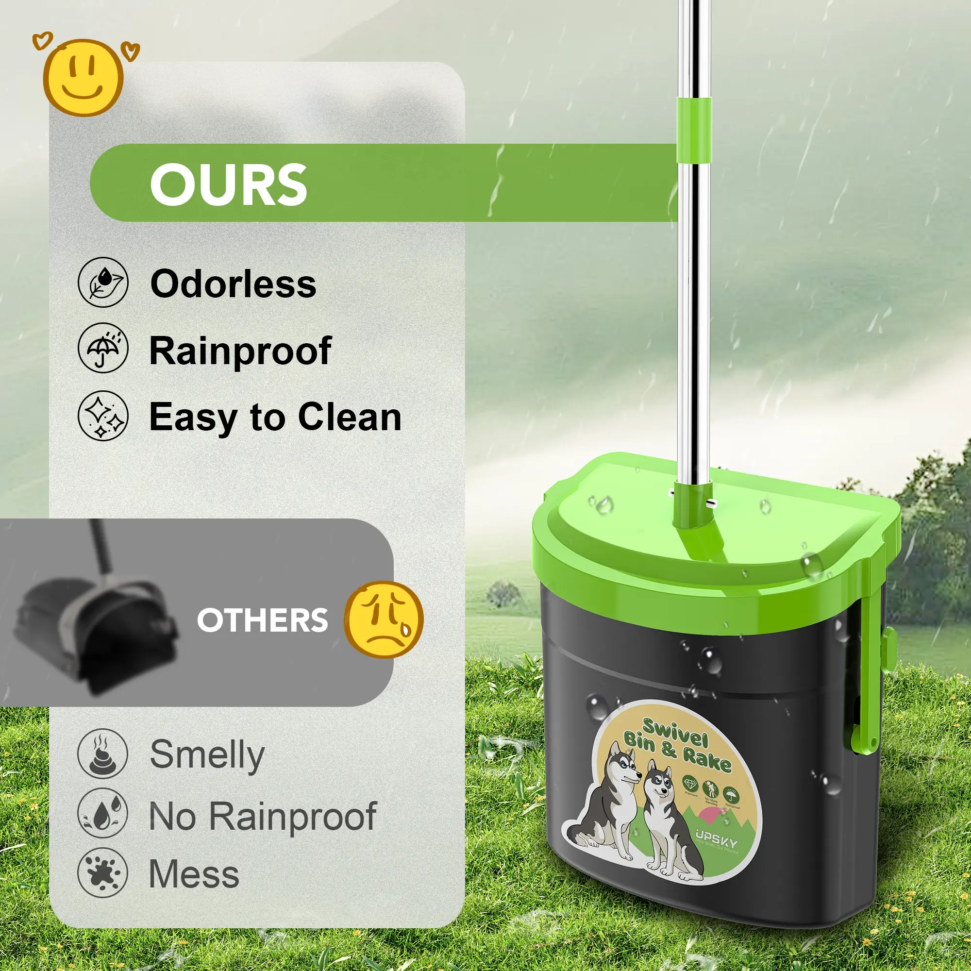 ·【Large Swivel Bin & Metal Rake Kit】This large swivel bin and metal rake kit simplify cleanup for large or multiple dogs. The trash can features an anti-odor lid and a robust rake, perfect for yards and multi-dog homes.
