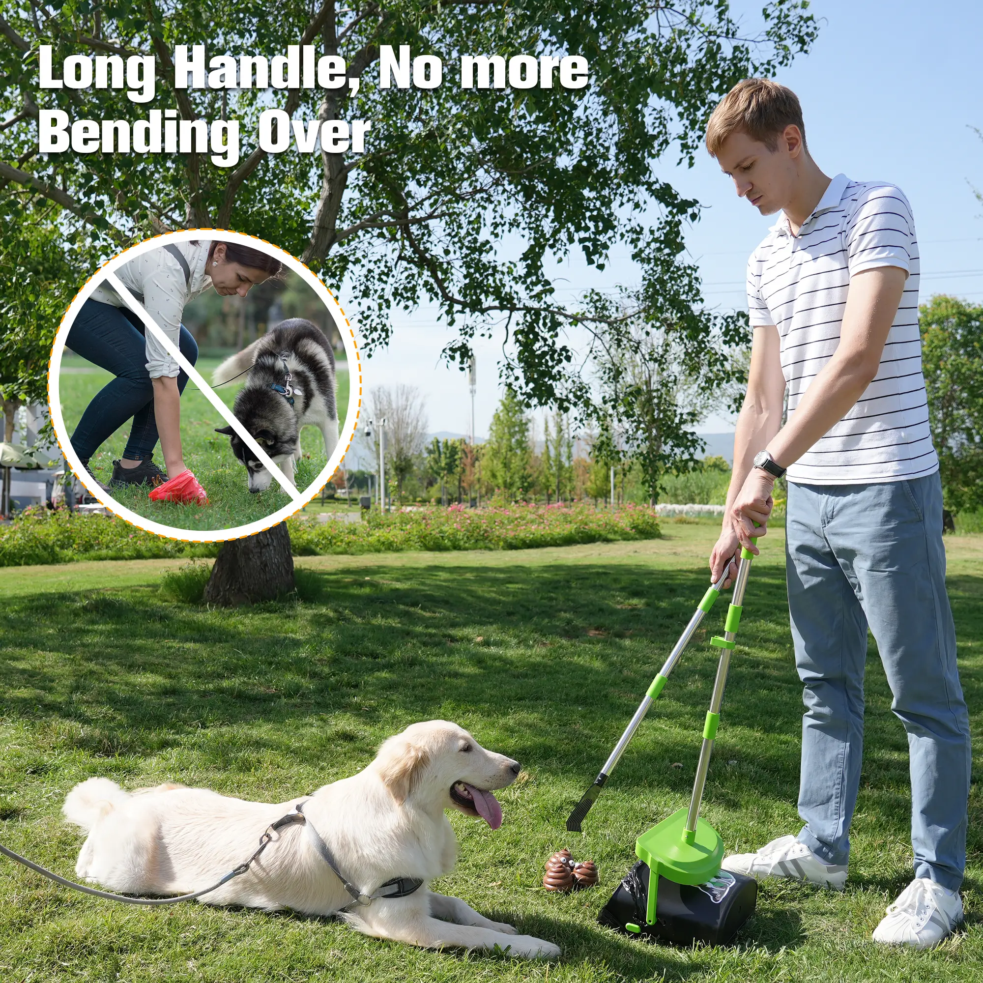 ·【No More Bending Over】This dog poop scooper includes 33.4 inch adjustable ergonomic handle for comfortable, tool-free assembly, reducing back and knee strain for a convenient cleanup experience.