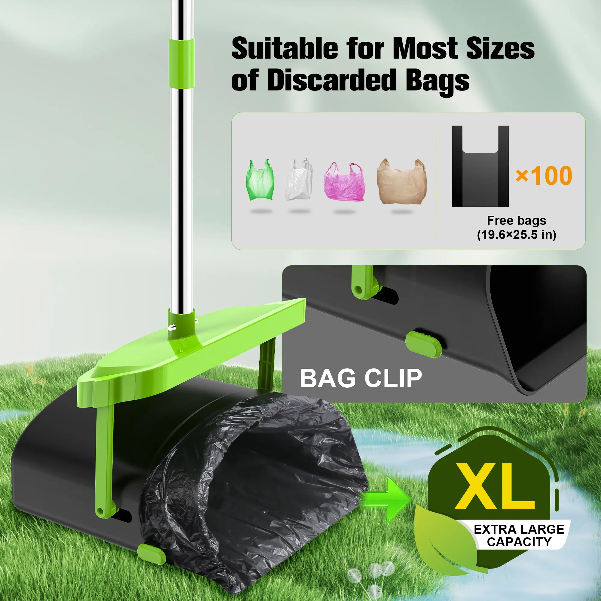 ·【100 Waste Bags & Upgraded Locking Clip】Includes 100 poop scooper bags that fit most size bags and easy to replace. Designed with fixed bag clips on both sides of the large swivel bin. Please wrap the garbage bag around the bag clip several times to ensure it is fully secured to avoid slipping during use.