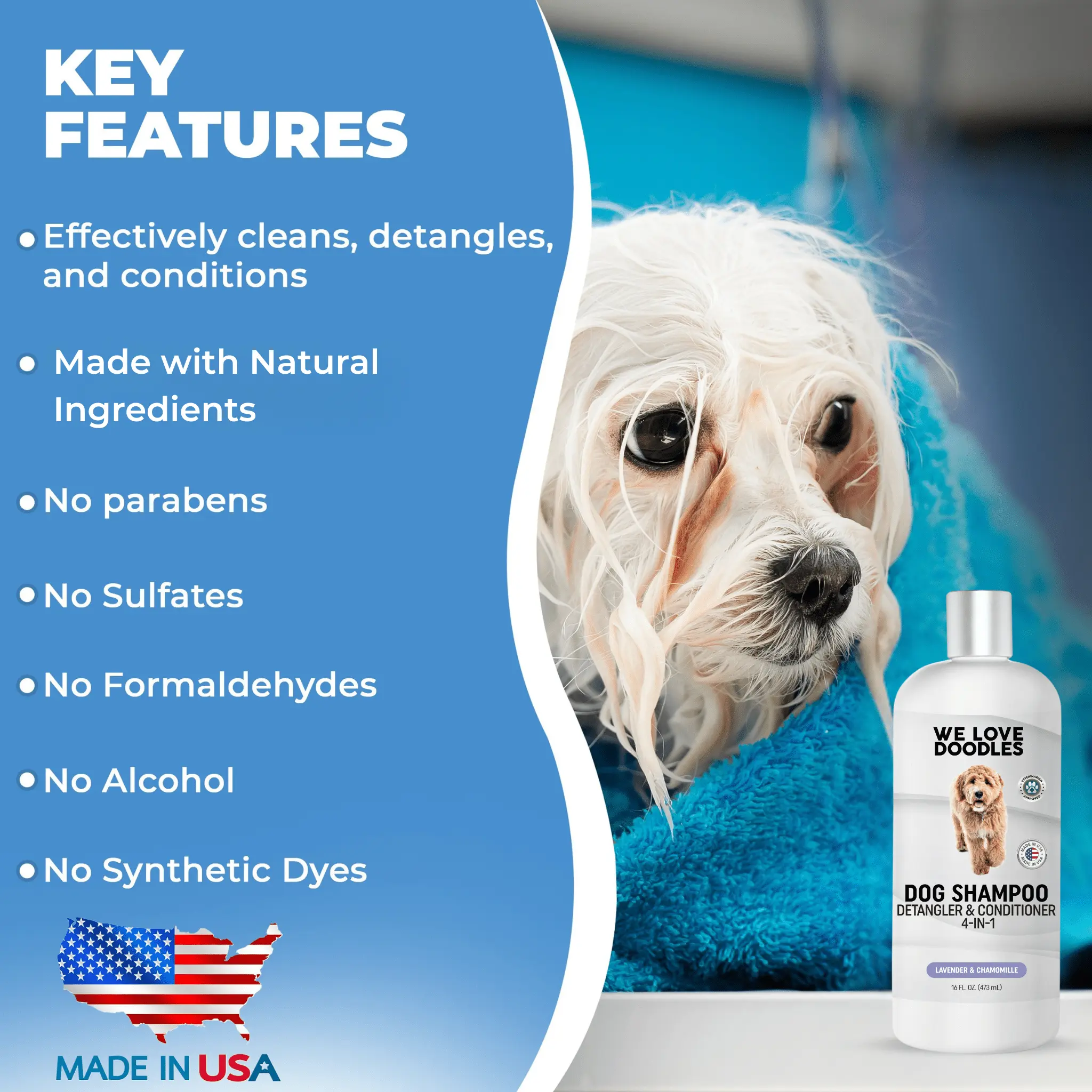 Tired of using multiple products just to get your dog clean and tangle-free? This 4-in-1 dog shampoo cleans, conditions, detangles, and moisturizes in one simple step—leaving your dog's coat soft, shiny, and smelling like fresh lavender without the hassle of extra products.