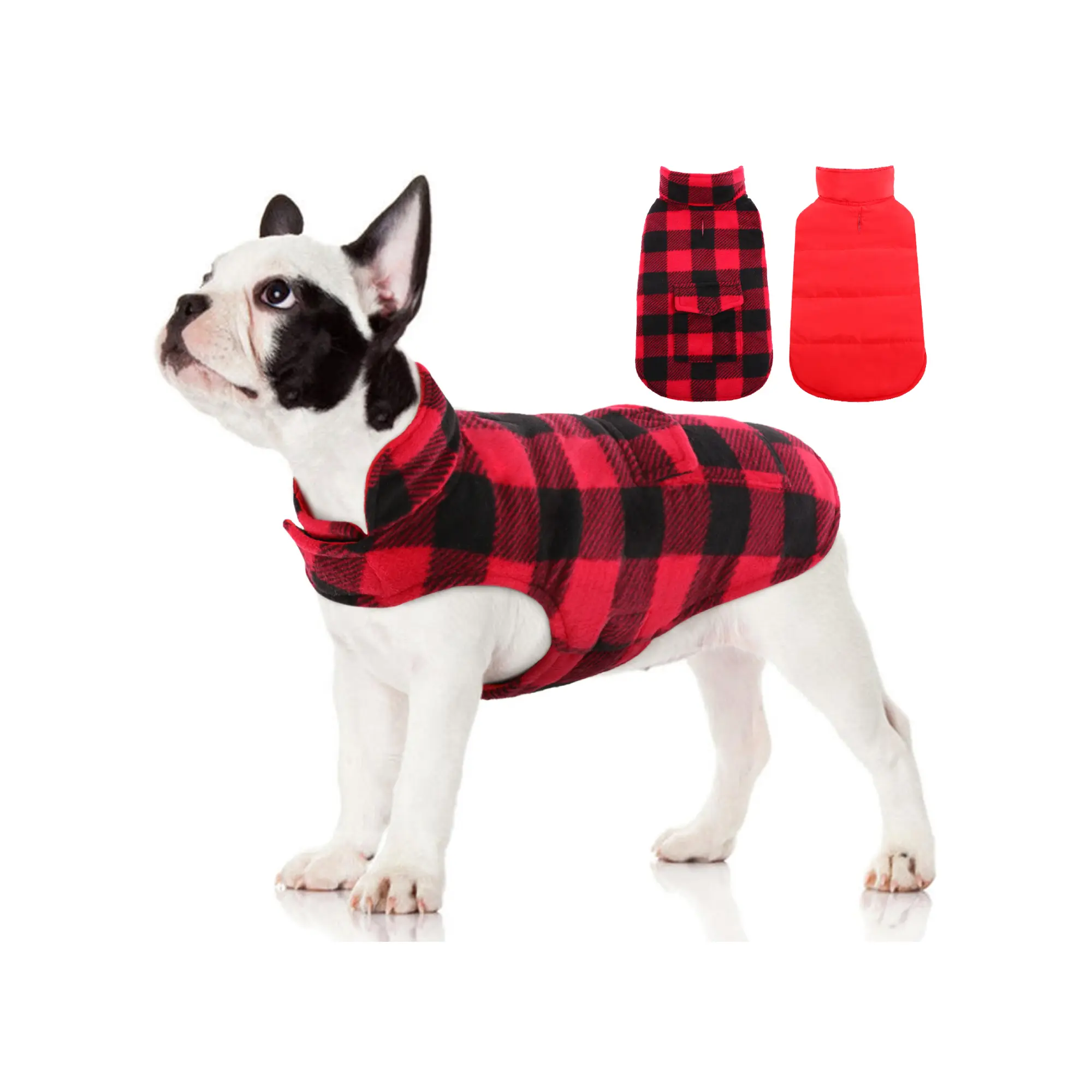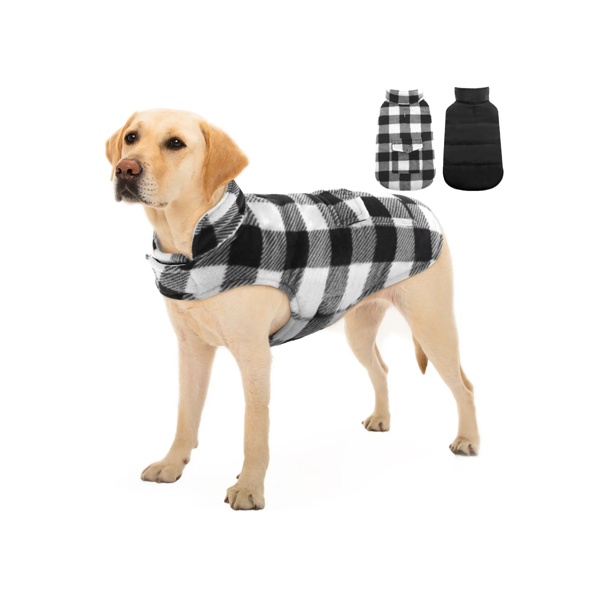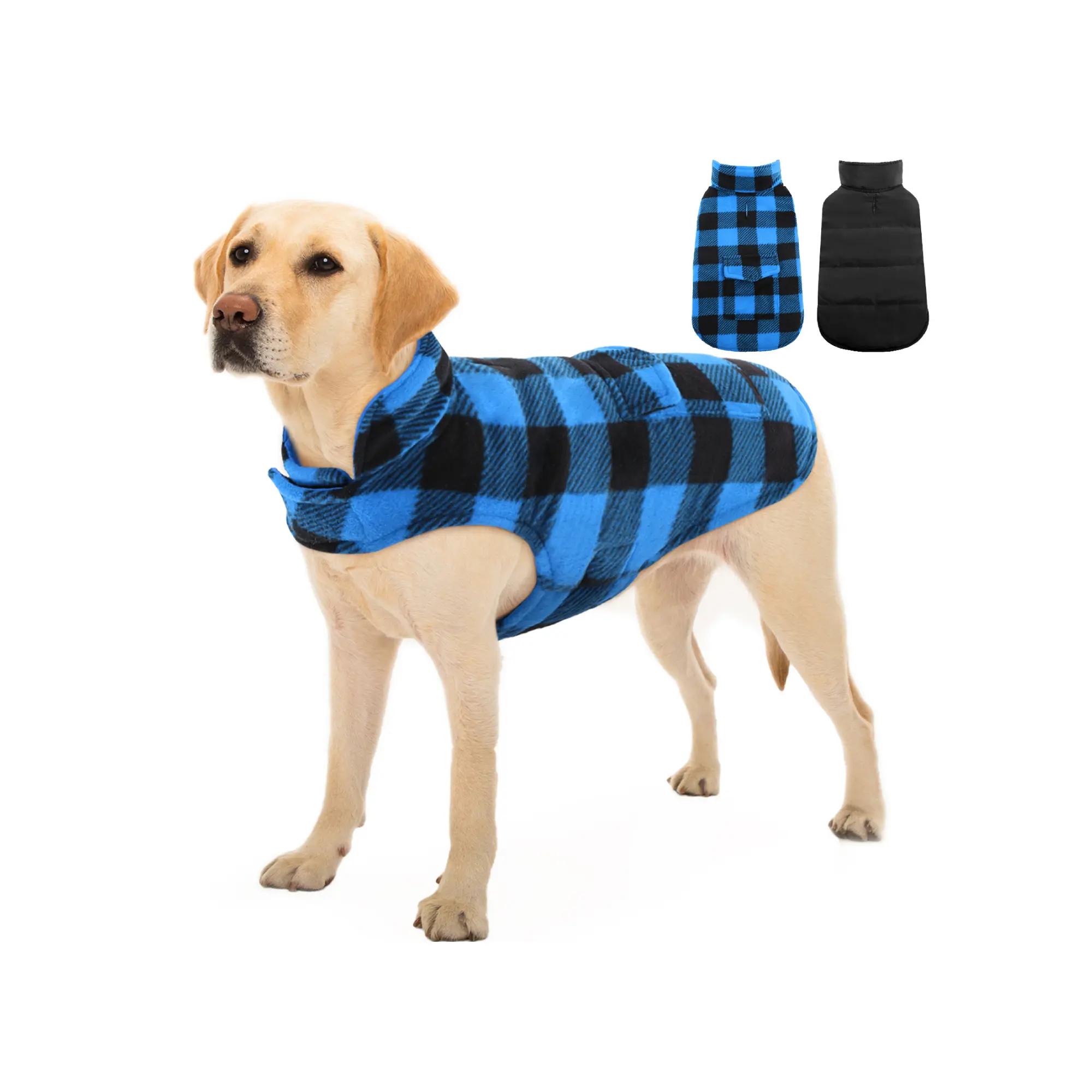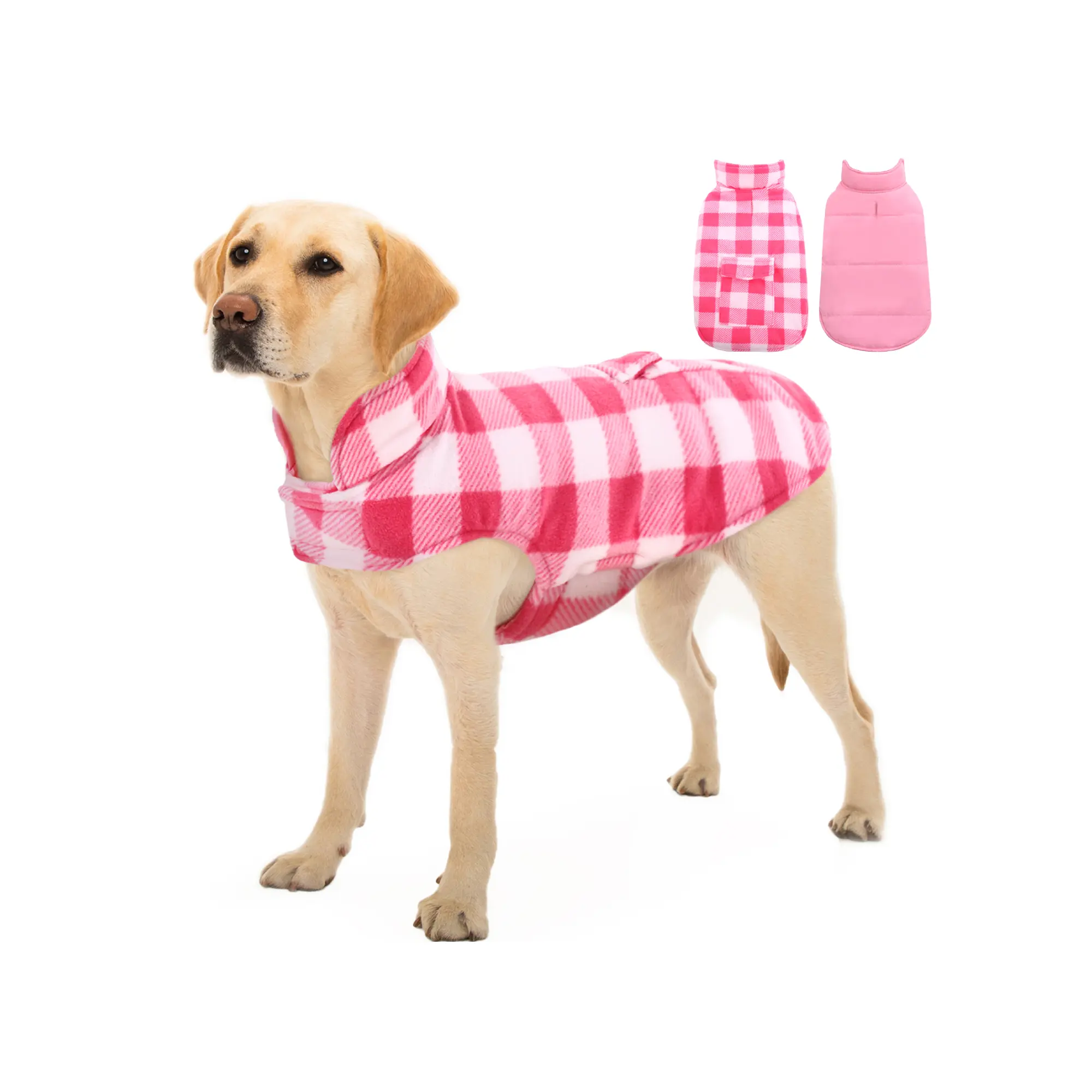Reversible Dog Winter Coat: Double-sided dog cold weather coat provides different choice for wear. Waterproof material on solid side lets your pet enjoy the outdoor time in cold winter, soft warm plaid on the other side is perfect for daily wear