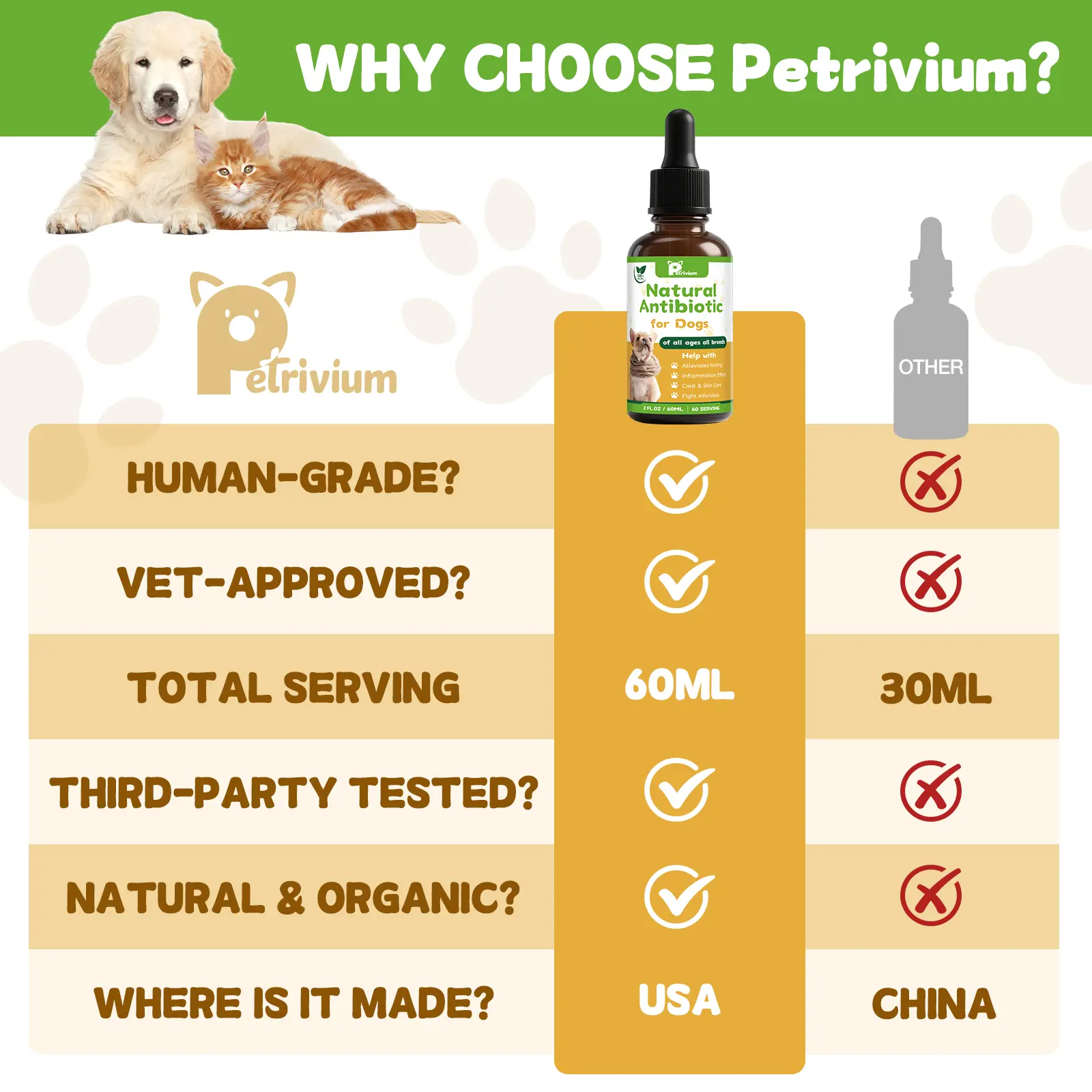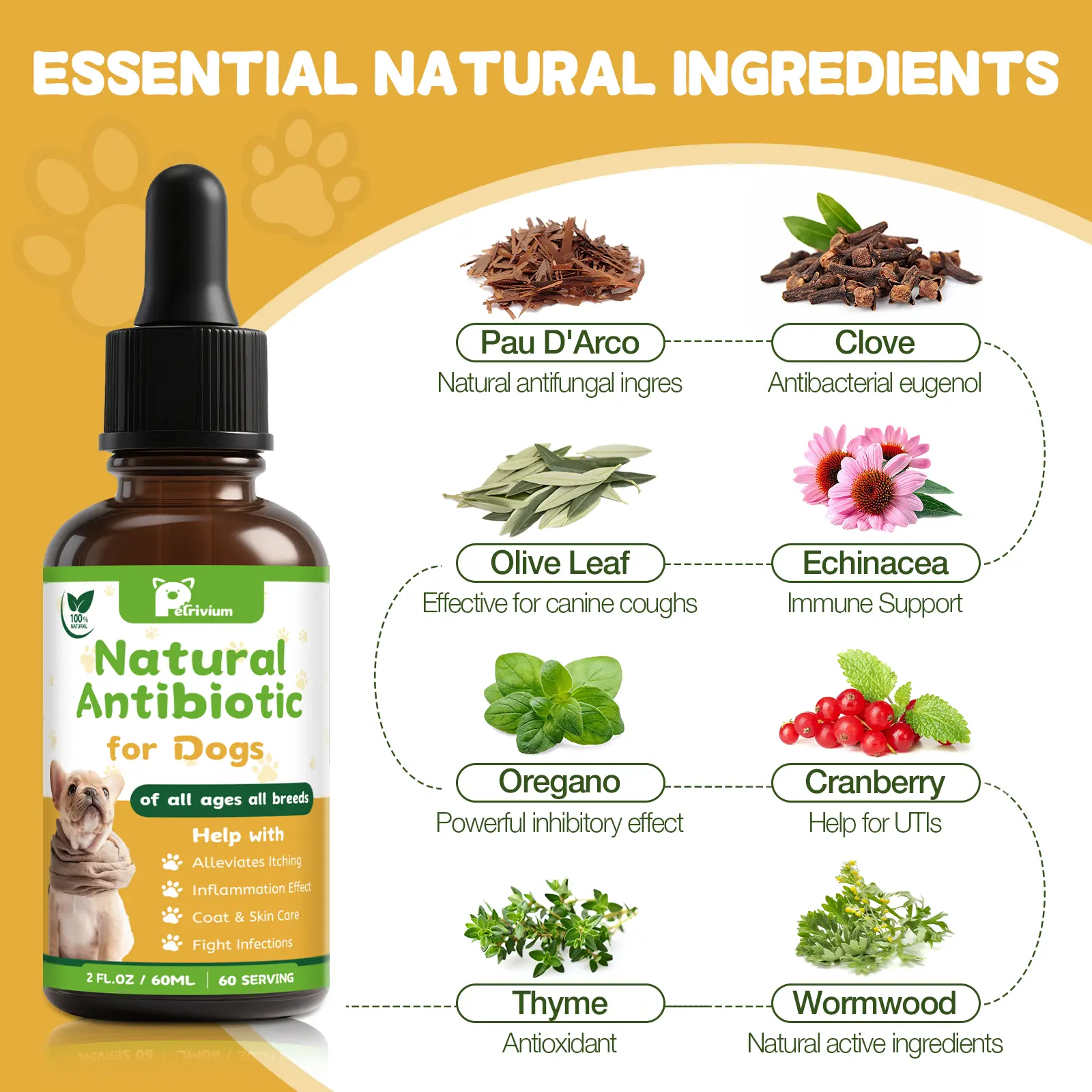 Crafted with organic and natural ingredients like Pau D’Arco, Cranberry, Goldenseal, Olive, Oregano, and probiotics. This herbal supplement contains no artificial additives, using a safe, plant-based formula to support your pet’s overall well-being.
