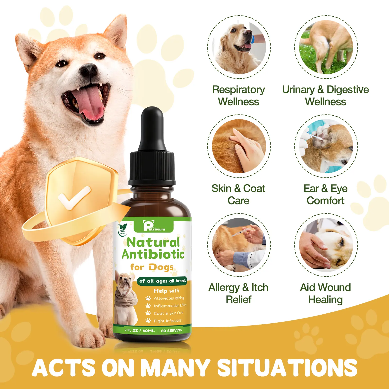 Our natural pet supplement provides gentle support for pets dealing with common concerns—including seasonal sensitivities, respiratory comfort, urinary wellness, ear and skin comfort, plus aids in maintaining healthy digestion. It’s designed to help pets feel their best during everyday challenges.