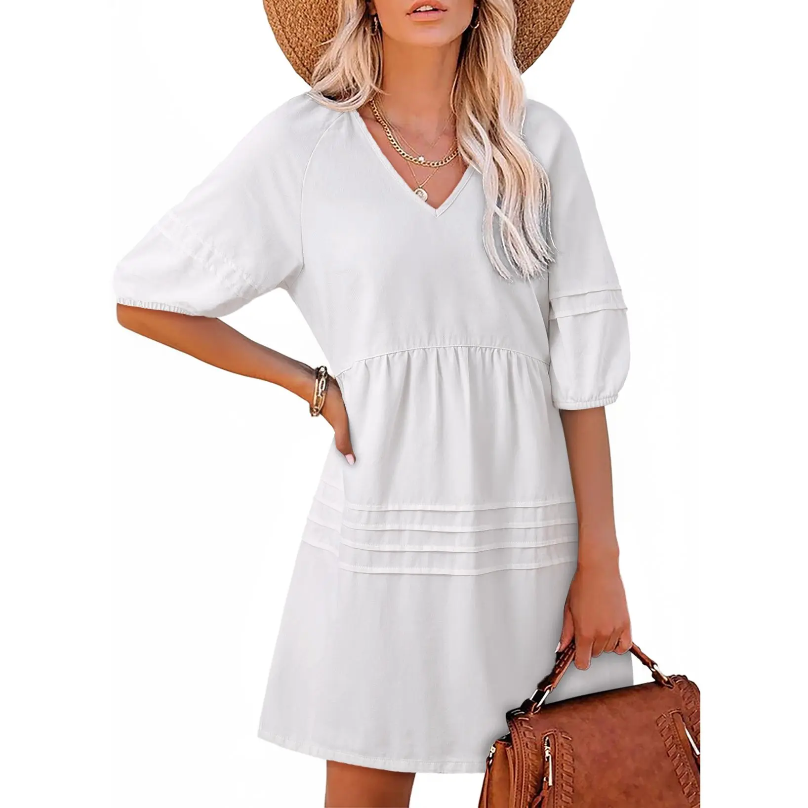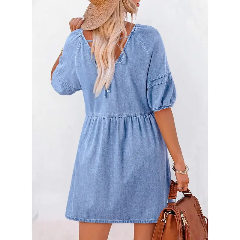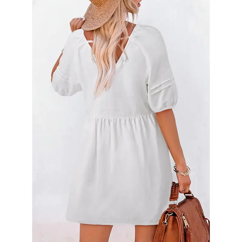 ·Features: Short Sleeve, Puff Sleeve, Cute V Neck, Soft Cotton Fabric, Mini Short Length, Solid Color, Loose Fit Design, Elastic Cuff, Back Tie Design, Casual Style Dresses
