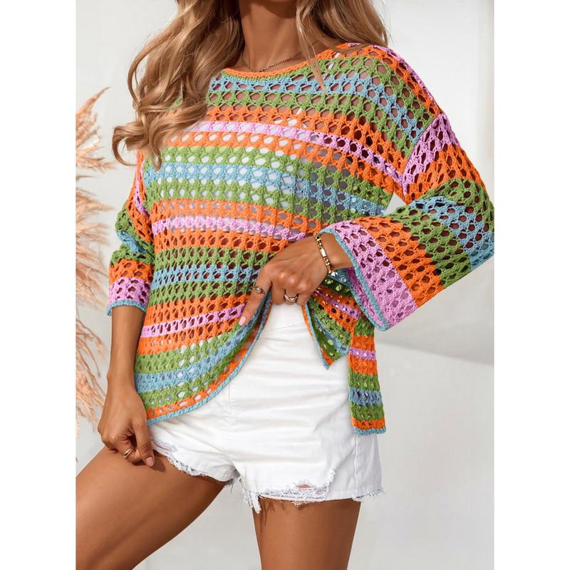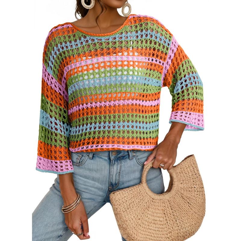 ·Design: Embrace boho vibes with unique women sweaters featuring bold color block stripes and a trendy crochet hollow out pattern. The playful mix of colors and open-knit texture create a laid-back summer feel, making it a must-have for fans of boho tops for women and fashion-forward beach cover ups for women.