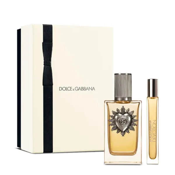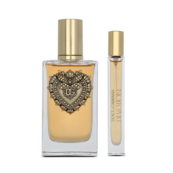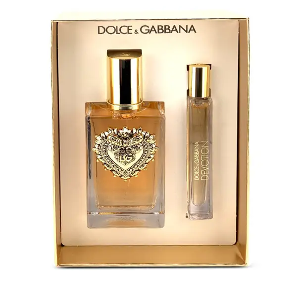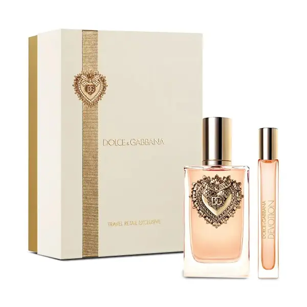 Dolce & Gabbana Devotion Eau de Parfum is a luminous, sensual scent that radiates warmth and positivity. It opens with vibrant candied citrus notes before blooming into a creamy, floral heart of orange blossom. The base reveals a delectable fusion of Madagascar vanilla and musk — a signature gourmand finish that feels both modern and timeless. Packaged in a stunning gold-embellished heart bottle, this set embodies pure luxury and devotion.