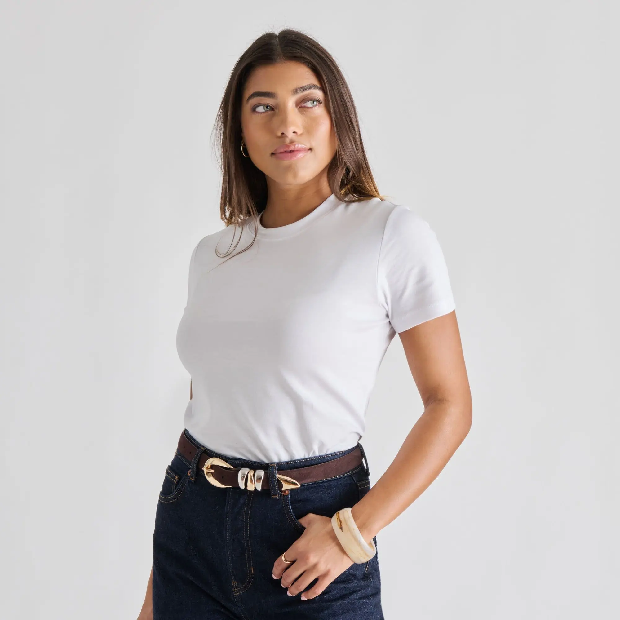 This sophisticated and modern leather belt features a chic mixed metal design slated to make a statement and elevate any outfit. Classic and luxurious black leather meets a rounded belt buckle, a dagger-like capped end, and three metal keepers in alternating light gold and light silver. Put this final touch on display in high waisted jeans and a tucked-in tank with ballet flats for an effortlessly cool look. For dressed up occasions, pair this hardware-heavy accessory with trousers, chunky sweaters, and prep-inspired loafers or over a collared midi dress with kitten heels.