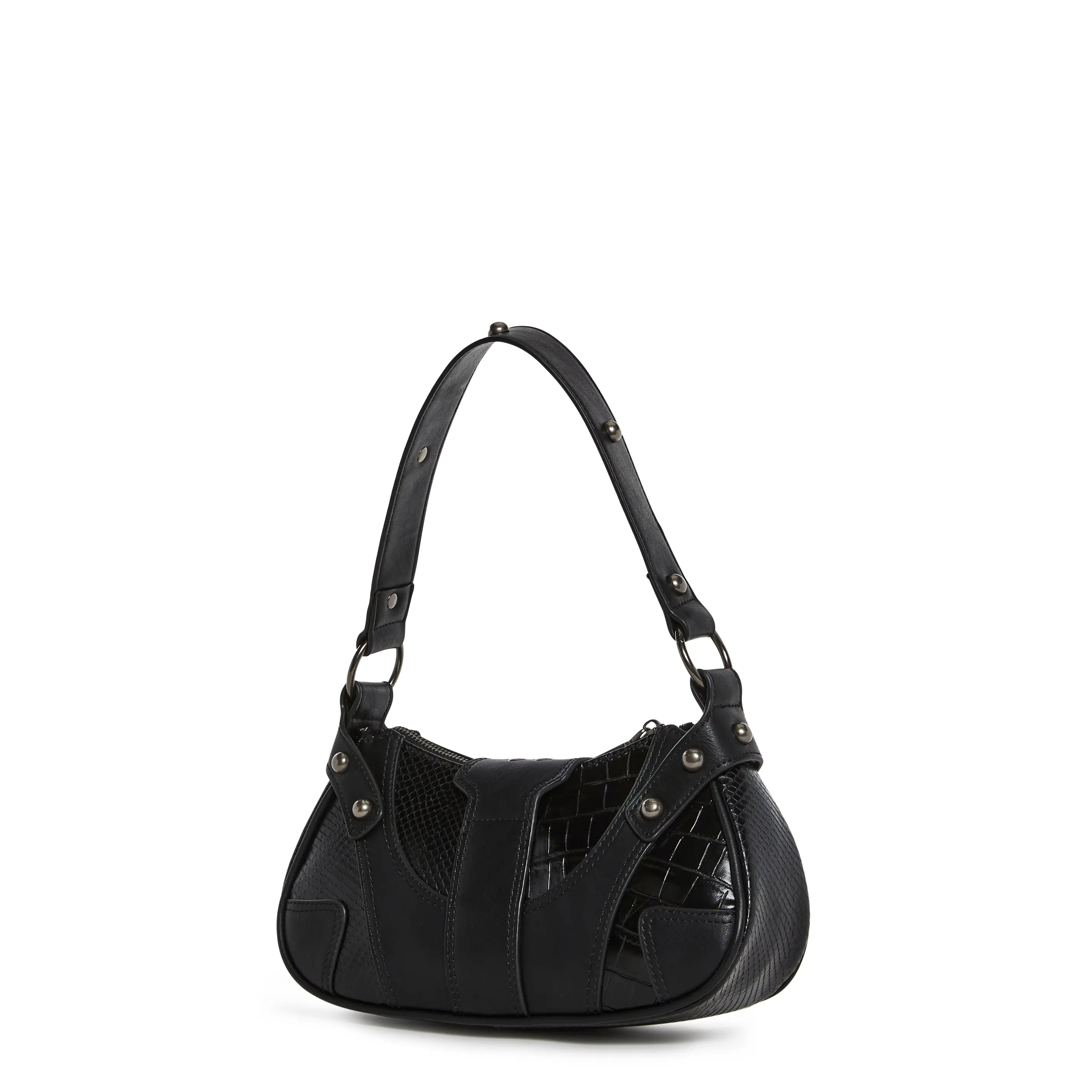 This shoulder bag has a mixed vegan leather construction with a patchwork design that features a snake and alligator print pattern, ball stud detailing, D-ring hardware, a top shoulder strap, and a top zipper closure with a buckle snap button closure.