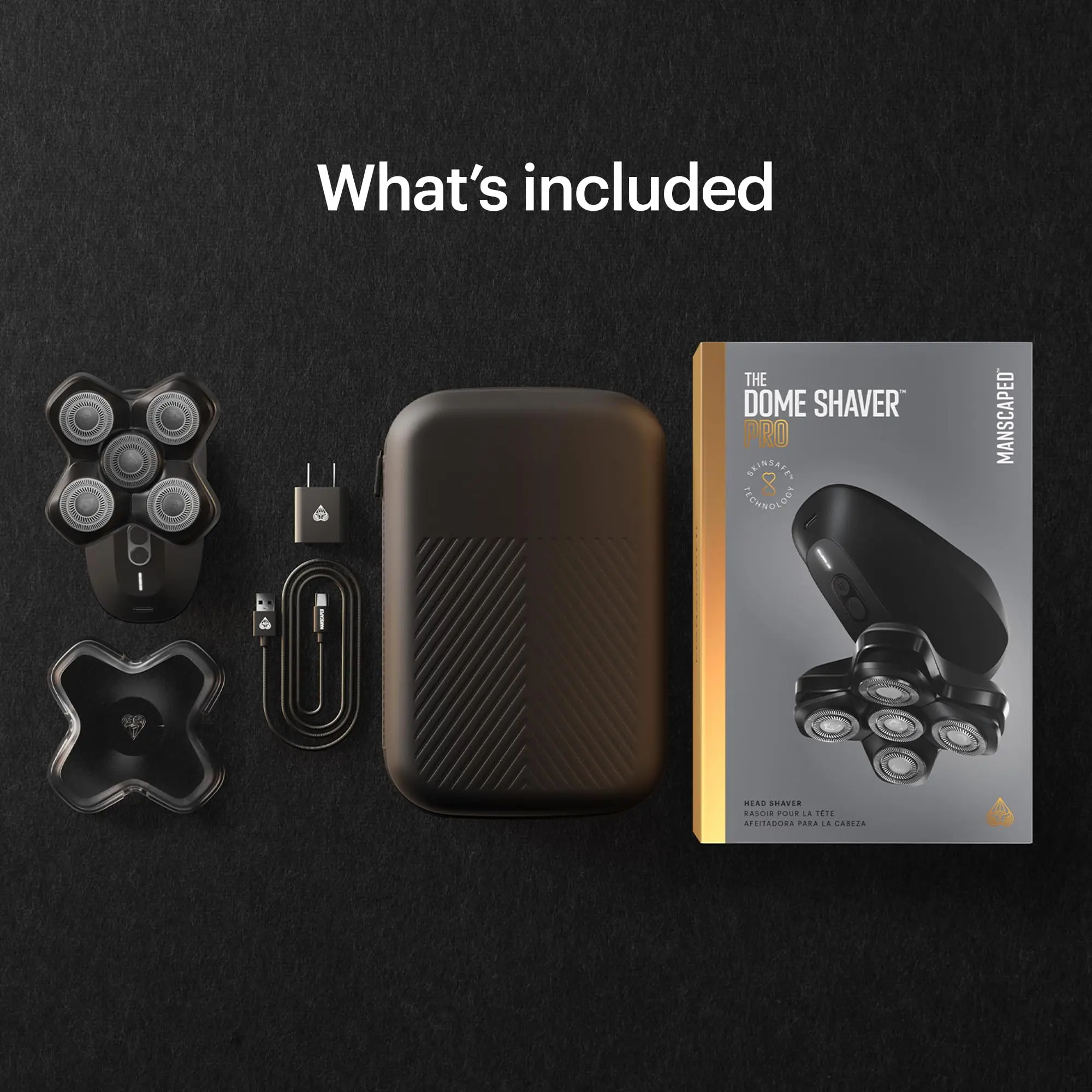 The Dome Shaver PRO - the ultimate head shaver designed for the modern man with no hair. Featuring SkinSafe* Technology, its 5 double-track blade heads and ultra-thin stainless-steel foils provide precision, while the curved blade pad and FlexAdjust Technology contour seamlessly to your head for an effortless, close shave. It boasts a powerful 9,500 RPM motor and a long-lasting rechargeable battery, offering a reliable and consistent performance with every use. Waterproof** and easy to clean, it's perfect for both wet and dry shaving sessions. The ergonomic handle and magnetic detachable blade pad make for comfortable handling and quick blade changes. Keep your grooming routine mess-free with the integrated hair chamber and enjoy the convenience of a travel lock for secure portability. Compatible with both USB-C and wireless charging. *SkinSafe technology does not guarantee cut protection. **IPX7 rated to protect against immersion in up to one meter of fresh water for up to 30 minutes.