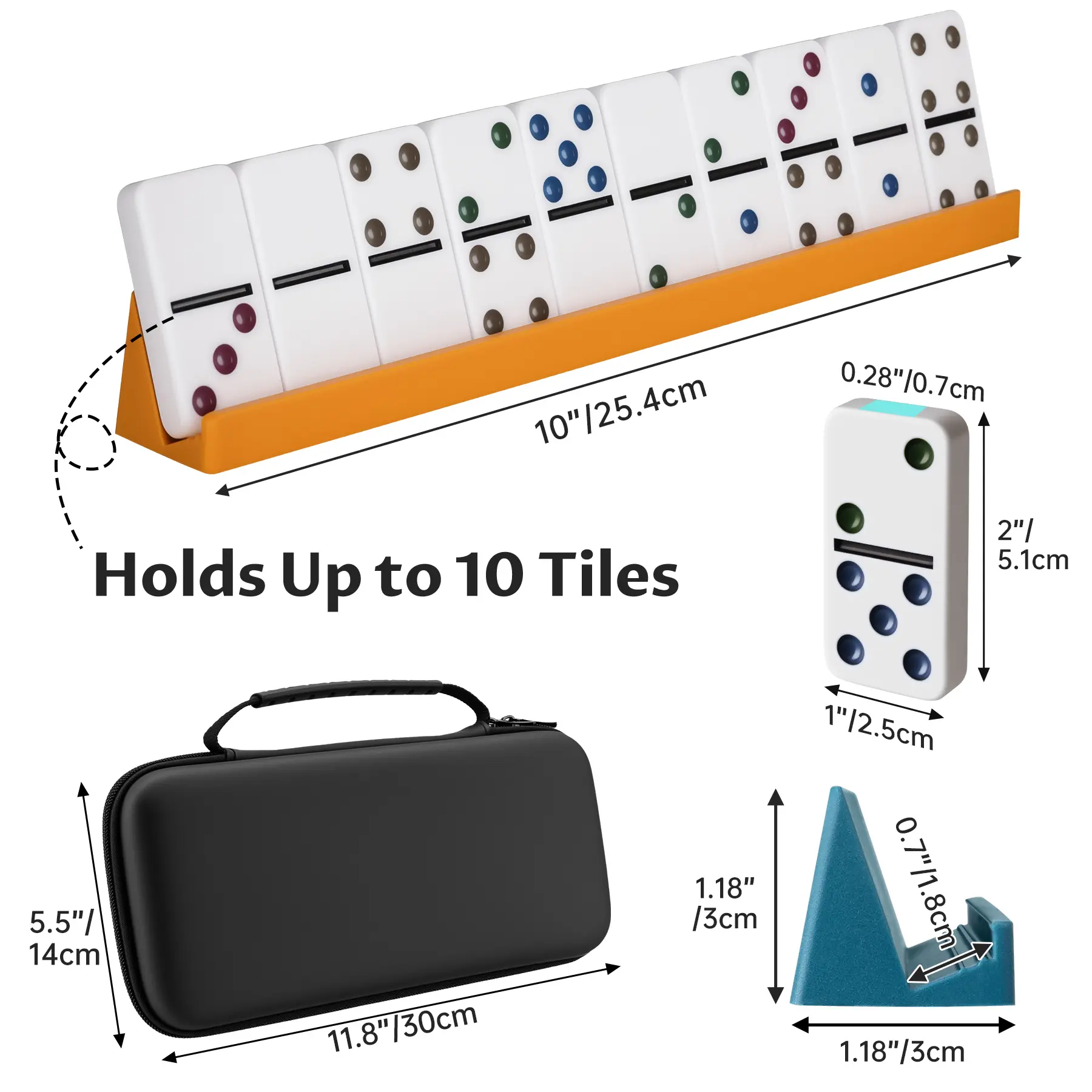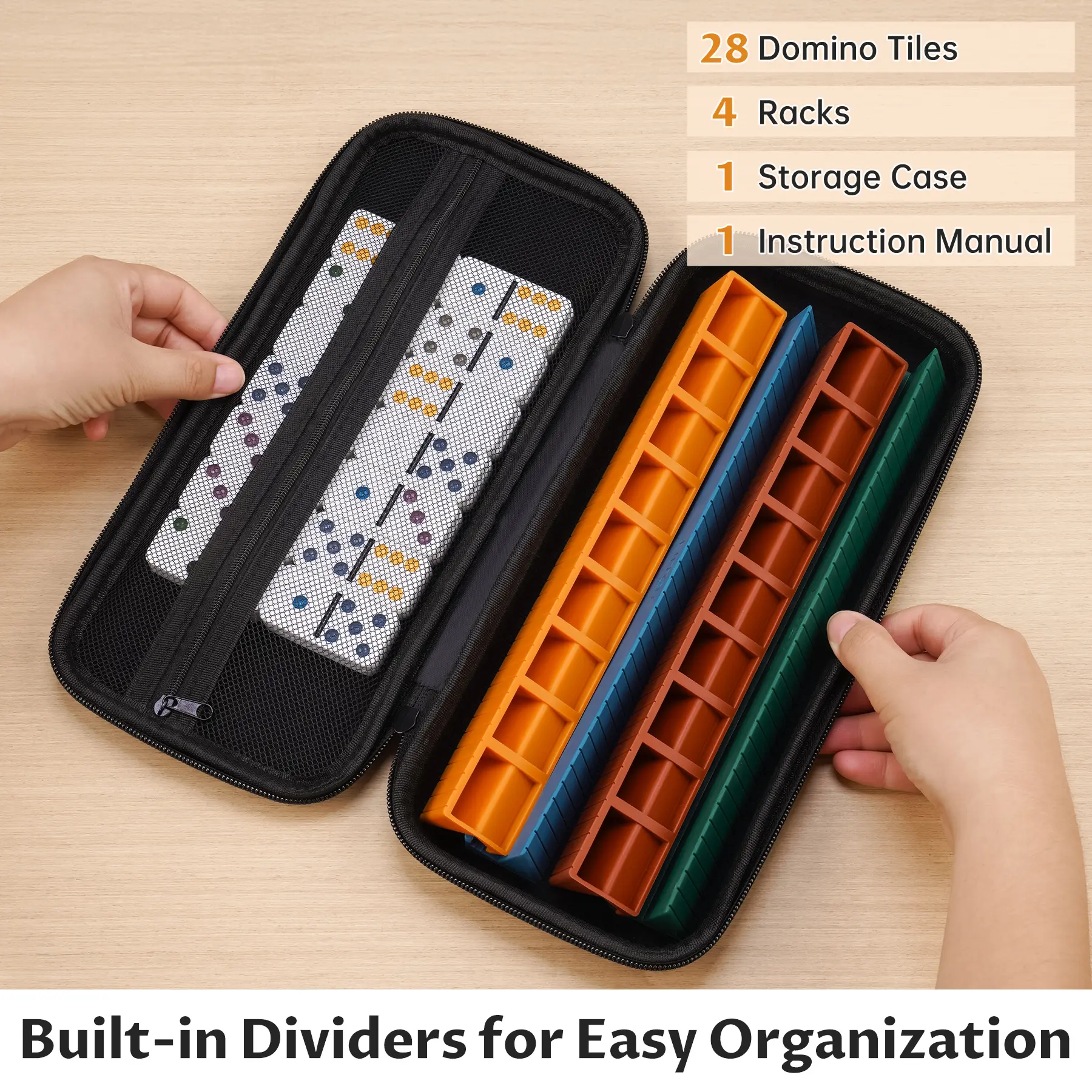 ·All-in-One Travel-Friendly Set: Includes 28 double-six dominoes, 4 colorful silicone racks, an instruction manual, and a zippered case for easy storage and travel.