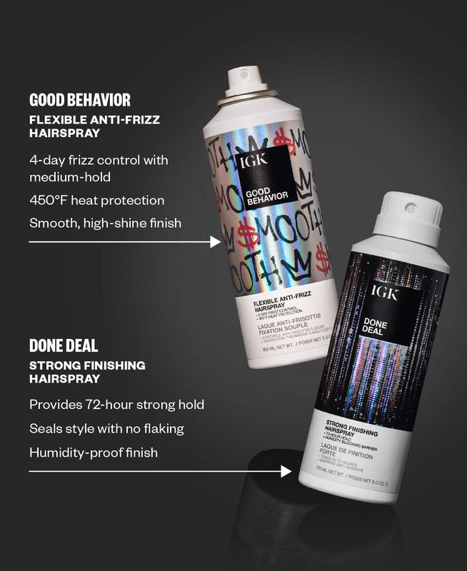 lock in your style and shine with our Done Deal Strong Finishing Hairspray 🖤 #hairspray #igkhair #igk #hairessentials #shinyhair
