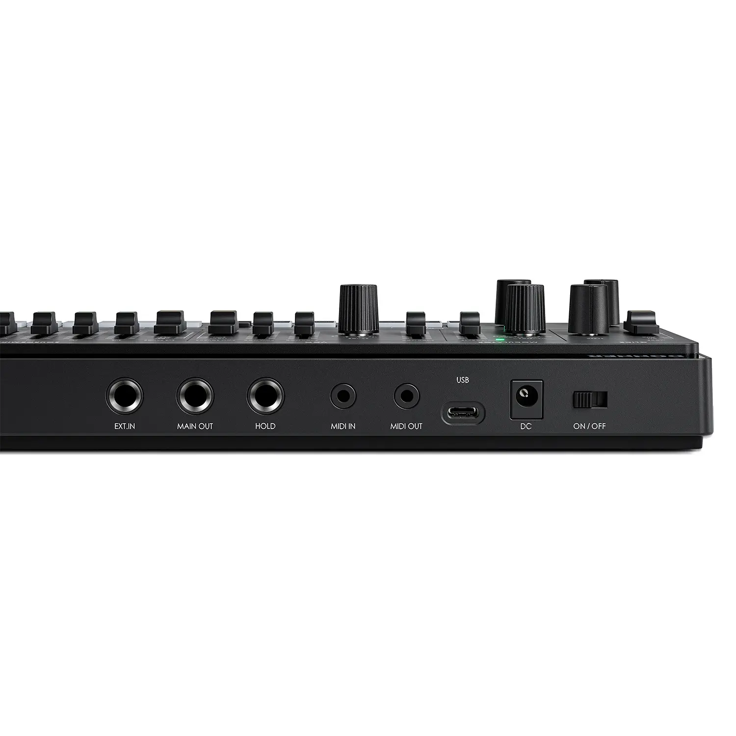 All-in-one connectivity for diverse setups: EXT. IN, MAIN OUT , HOLD PEDAL , MIDI I/O (mini TRS, Type-A) , USB (Type-C) , SYNC I/O , CV OUT , GATE OUT , PHONES