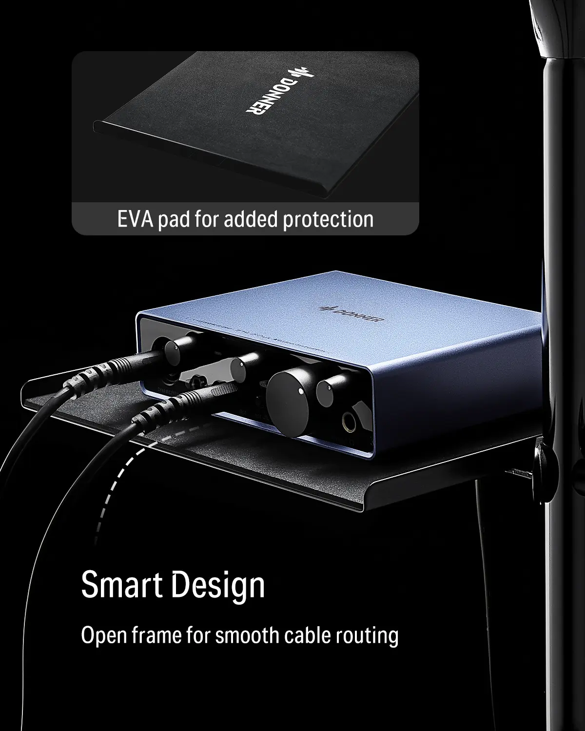 ·Large Surface with EVA Pad: Featuring a large 245mm × 200mm surface, the tray provides plenty of room to place microphones, headphones, drumsticks, and other accessories. The 3 mm EVA pad absorbs shocks and prevents scratches and slipping.