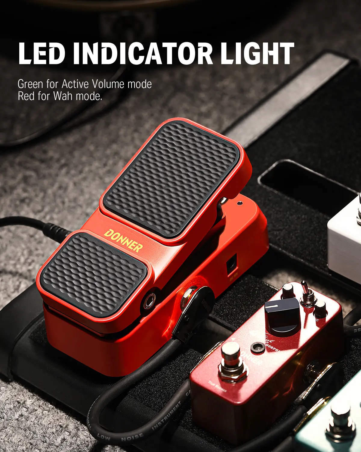 ·You can smoothly switch between Vol and Wah modes by pressing on the pedal with your foot. In the Wah mode, the LED lights will be red, then green for the Volume mode.
