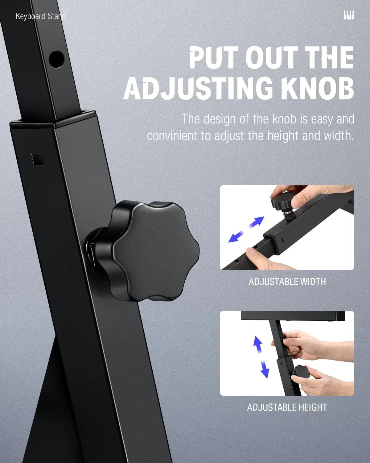 Donner Z Style Keyboard Stand uses a plug-in knob for adjustment. When you need to adjust, just loosen the knob and pull it out to adjust. (Note: Before pulling, you need to loosen the latch, and then tighten it after adjustment. Otherwise, the stand will be damaged.)